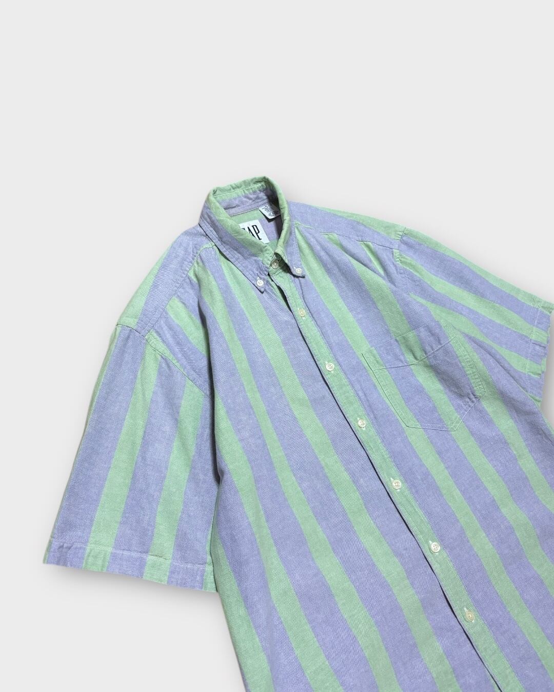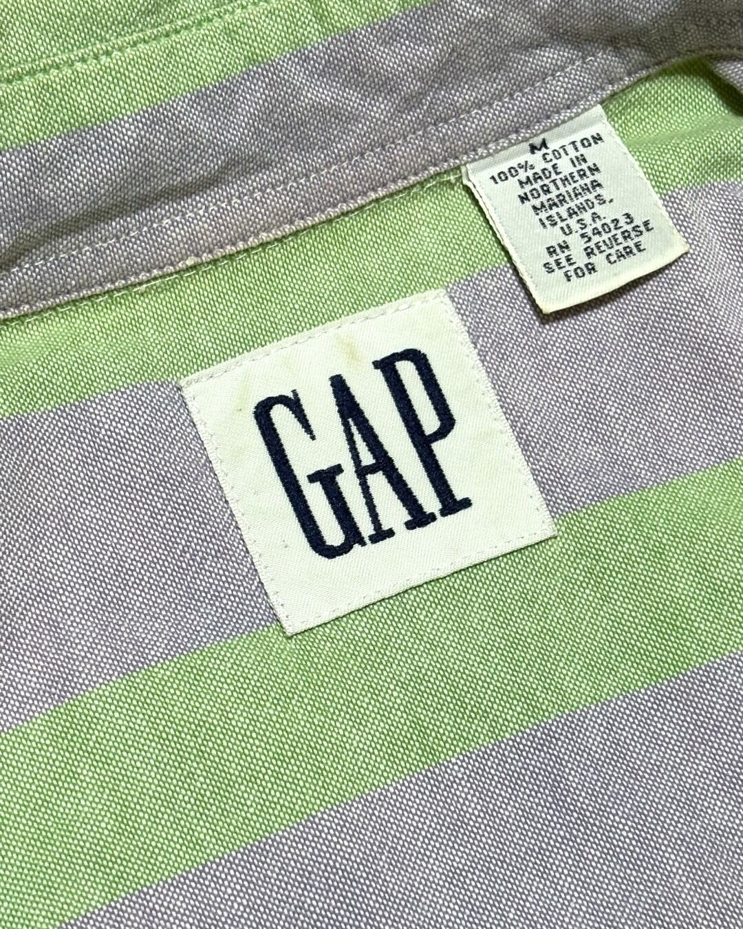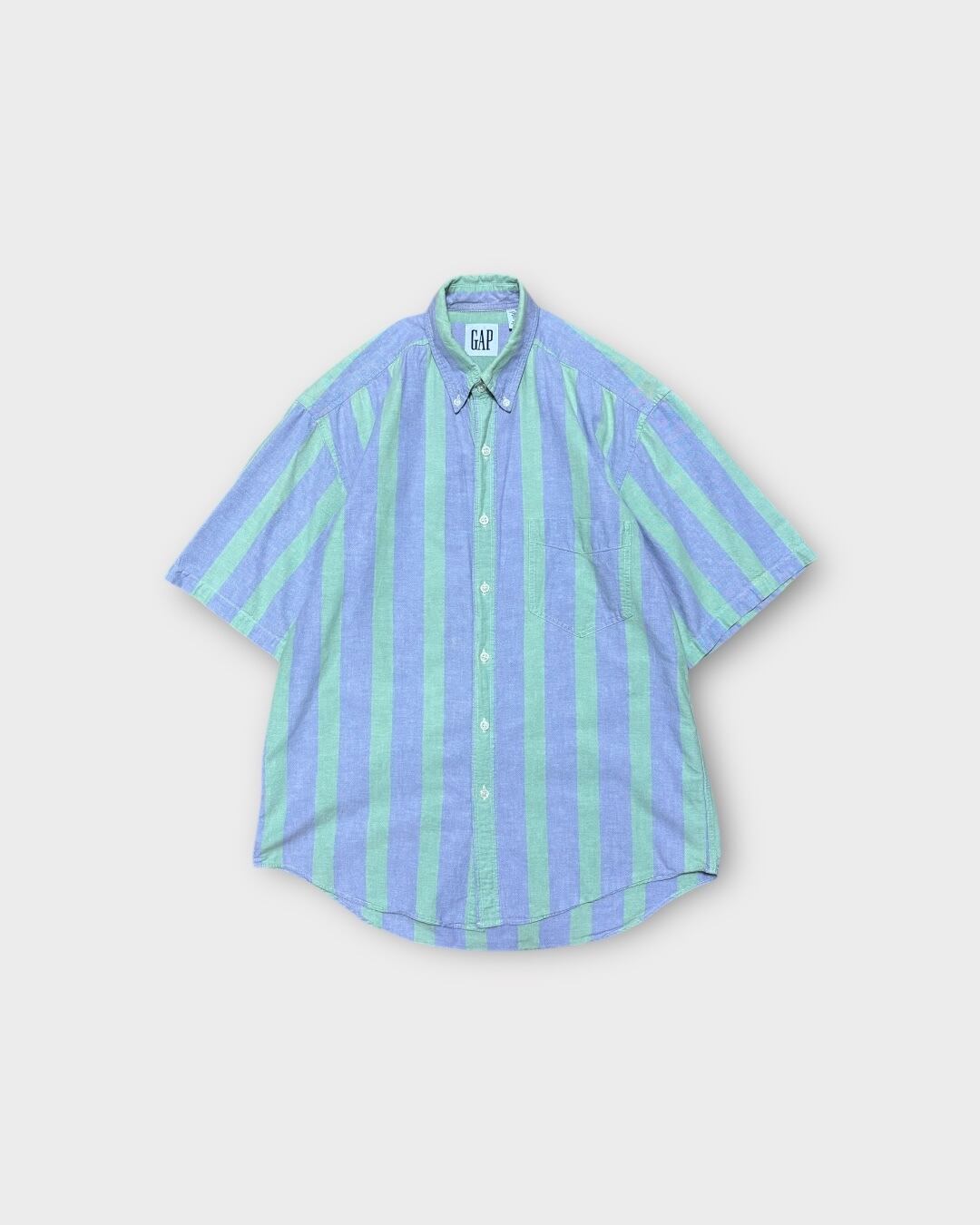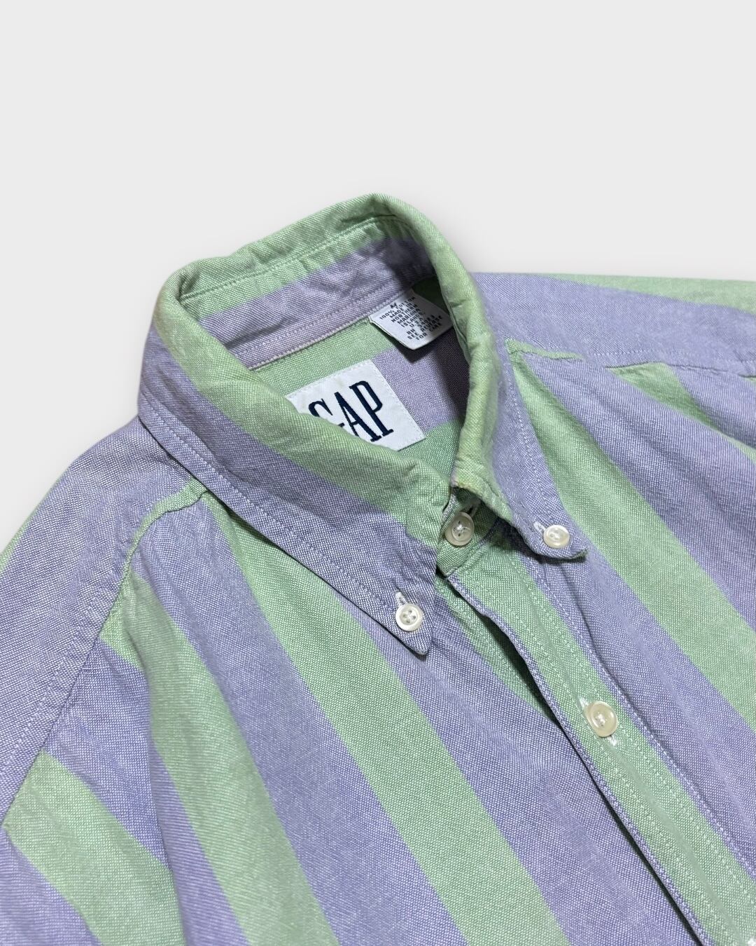 淡いパープルとグリーンのワイドストライプが印象的な、1990年代のGAP製半袖ボタンダウンシャツ。程よくフェードしたような色味とゆとりあるシルエットで、古着らしいニュアンスがしっかりと味わえる1枚です。