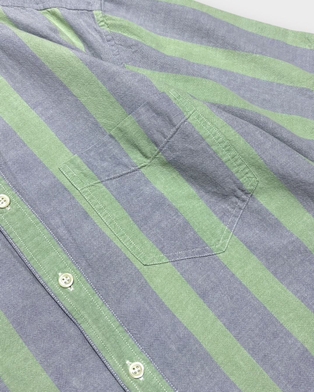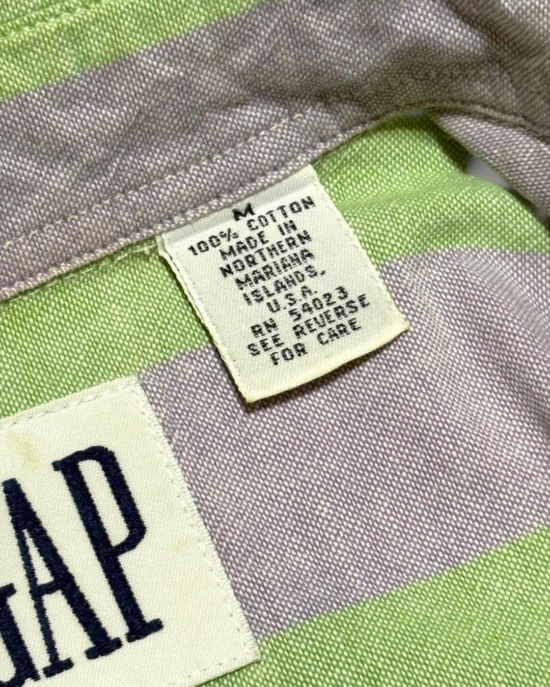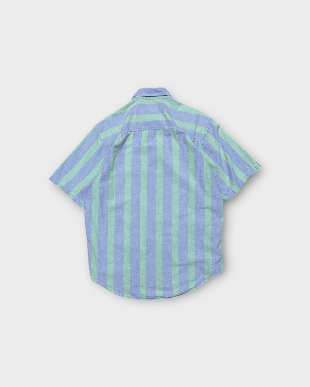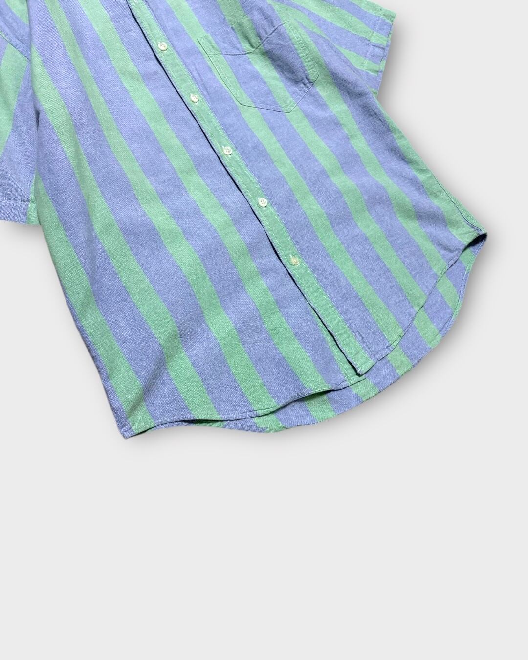 淡いパープルとグリーンのワイドストライプが印象的な、1990年代のGAP製半袖ボタンダウンシャツ。程よくフェードしたような色味とゆとりあるシルエットで、古着らしいニュアンスがしっかりと味わえる1枚です。