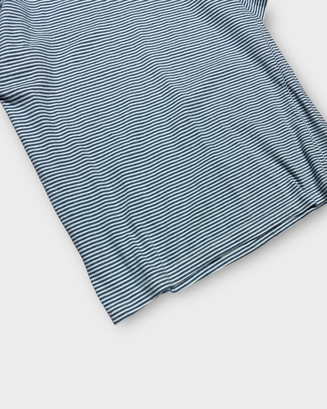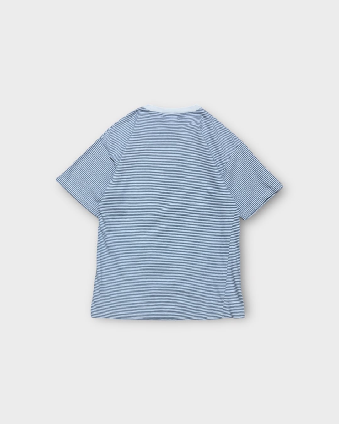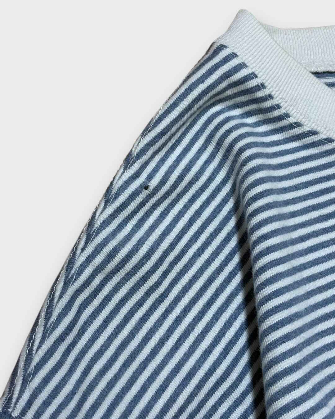 ブルーとホワイトの細かなボーダーパターンに、白のネックが映えるデザイン。シンプルながらしっかりと存在感のある一枚です。