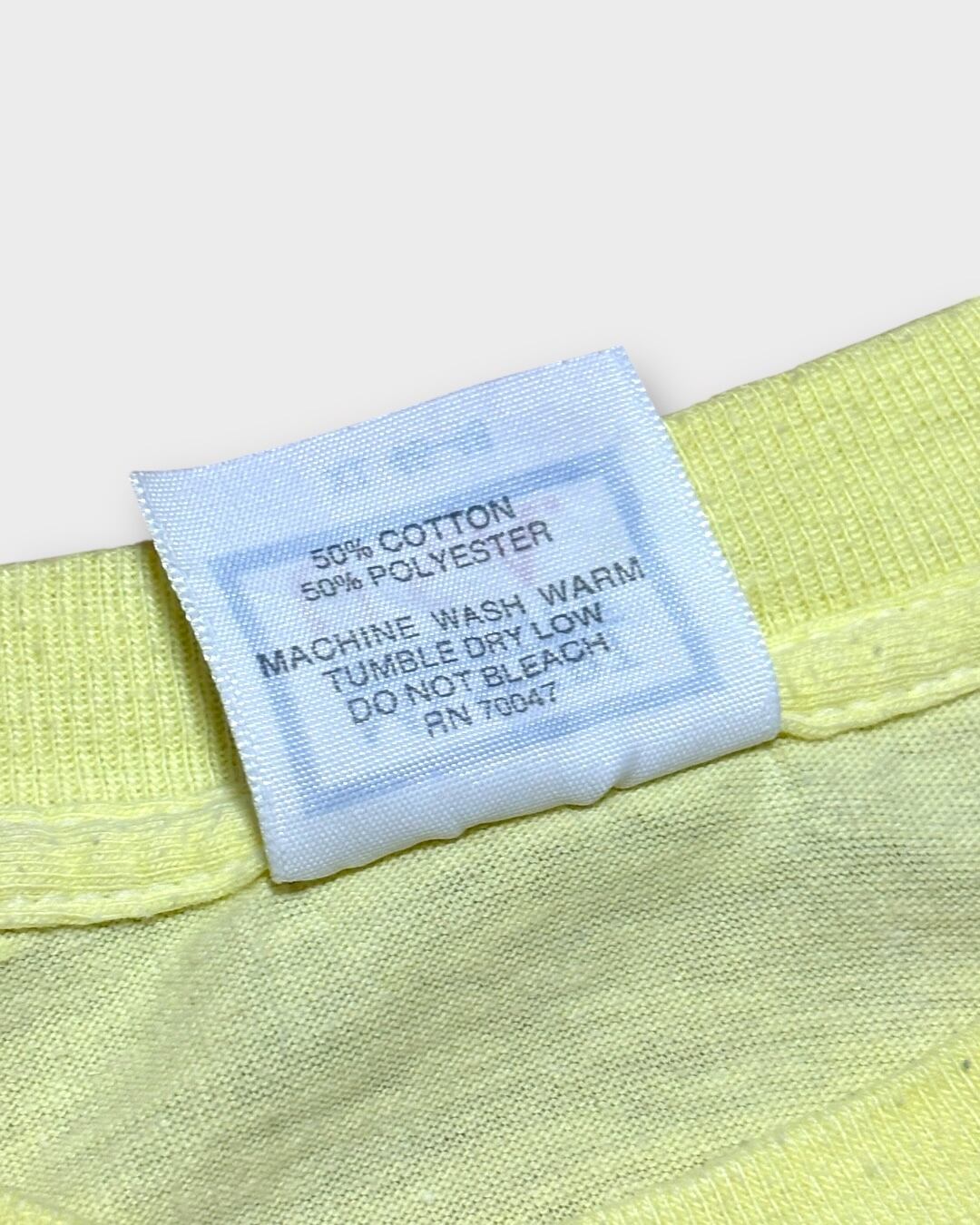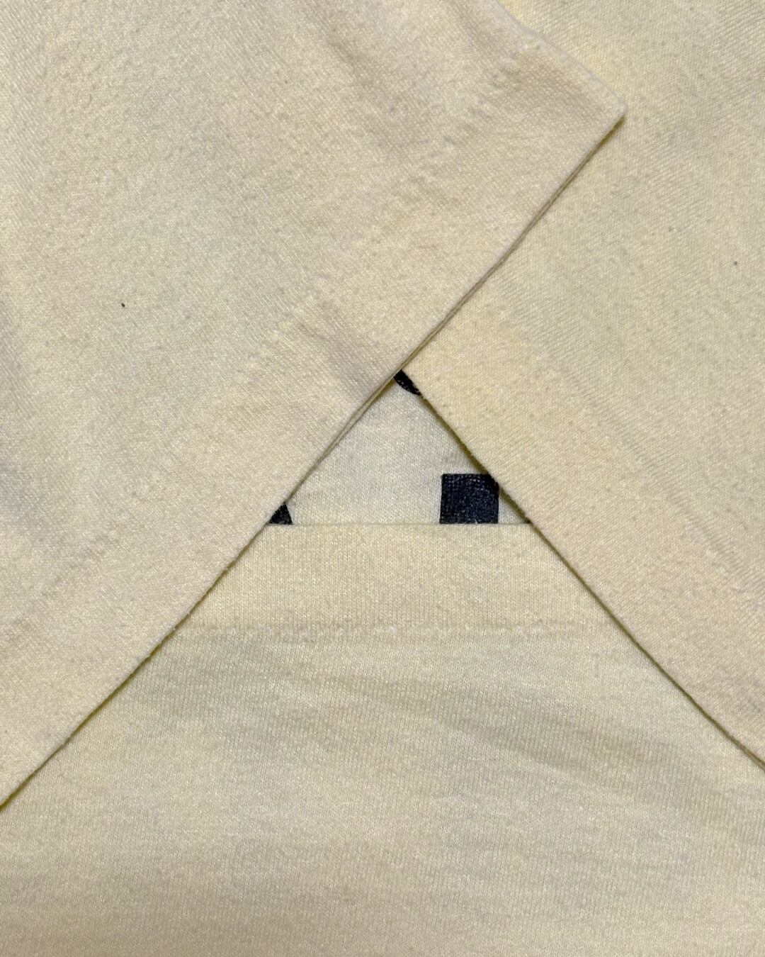 淡いレモンイエローのボディに、ブラックのプリントがしっかり映える配色。ボディはUSA製、50/50の混紡素材で柔らかく、軽い着心地も魅力です。