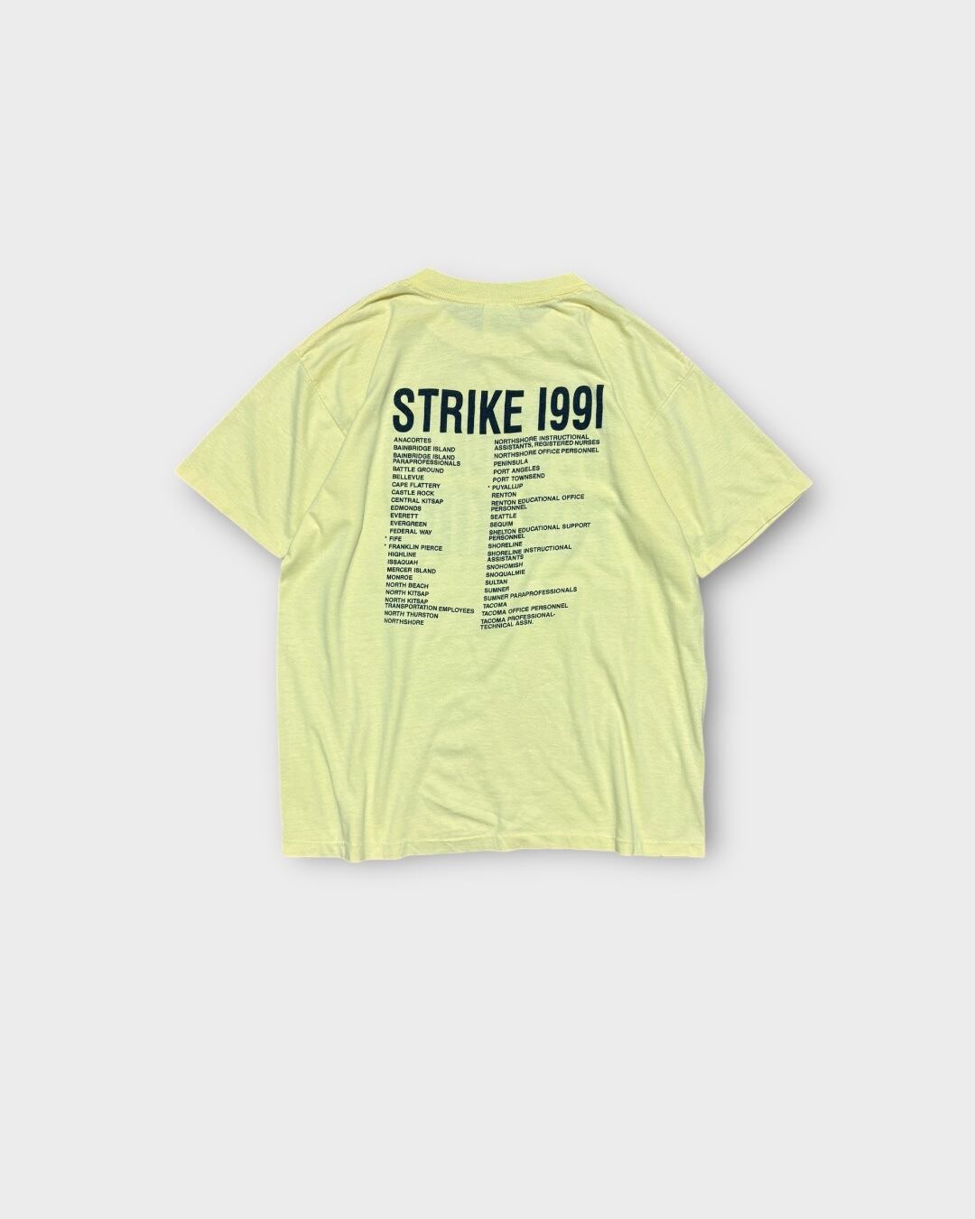 1991年の教職員ストライキを背景に制作されたプリントTシャツ。フロントには「WE STOOD UP FOR KIDS(私たちは子どもたちのために立ち上がった)」という力強いメッセージ、バックには「STRIKE 1991」と地域名や職種名がずらりと並び、当時の運動の熱量を感じさせる仕上がりです。
