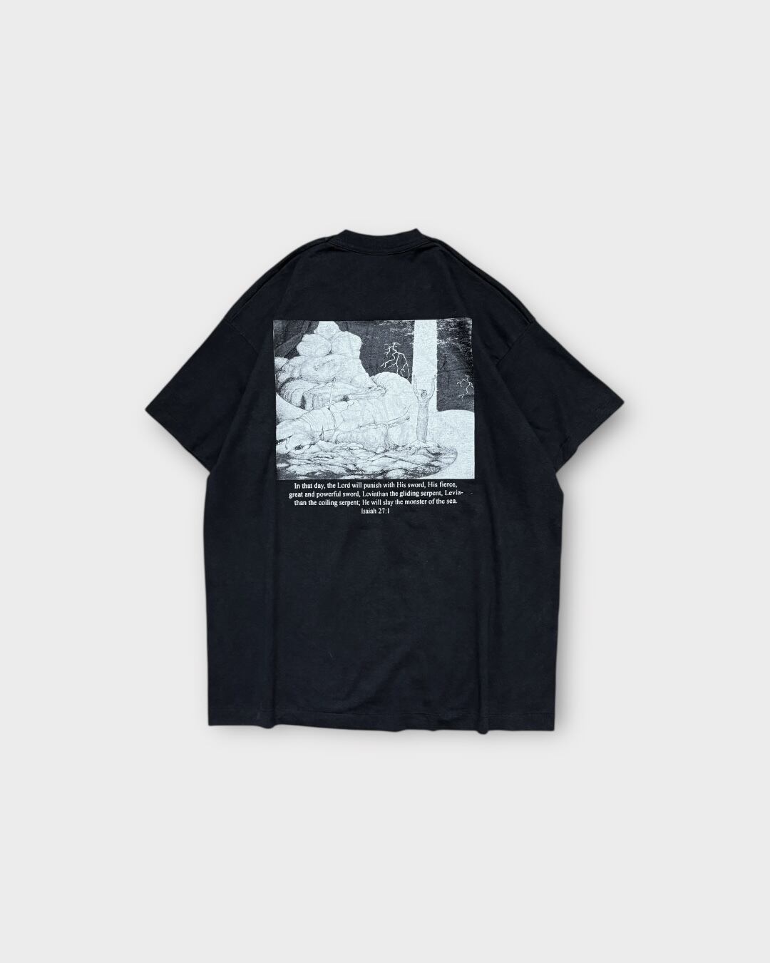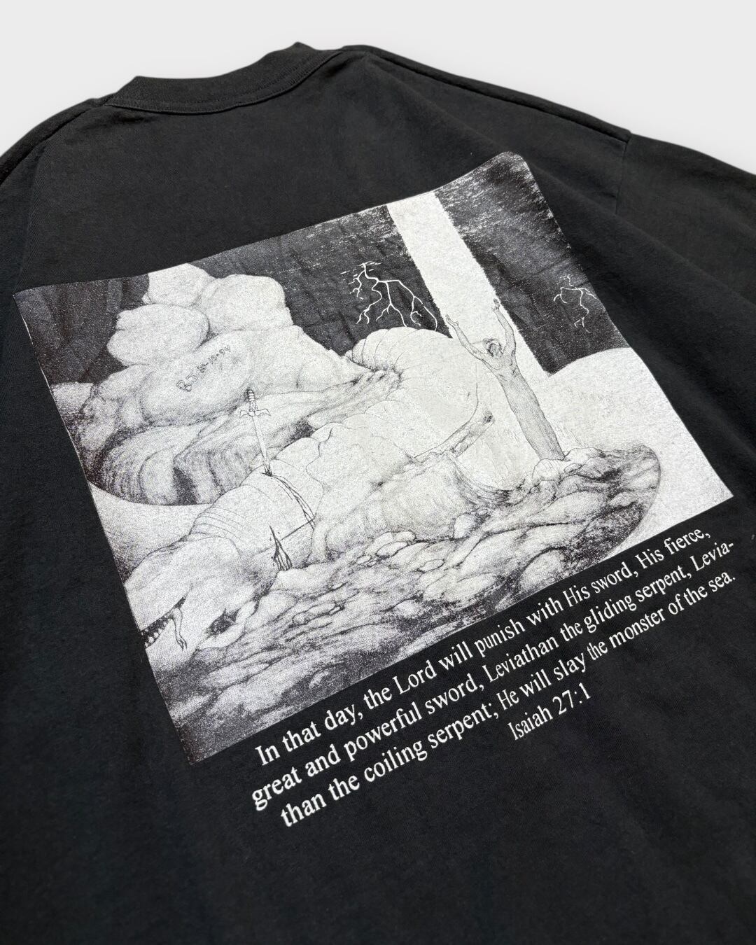 胸元に“CHURCH”、背面には旧約聖書「イザヤ書27章1節」の一文と、巨大な海の怪物・レヴィアタンを描いたインパクトあるグラフィックをプリントした1枚。