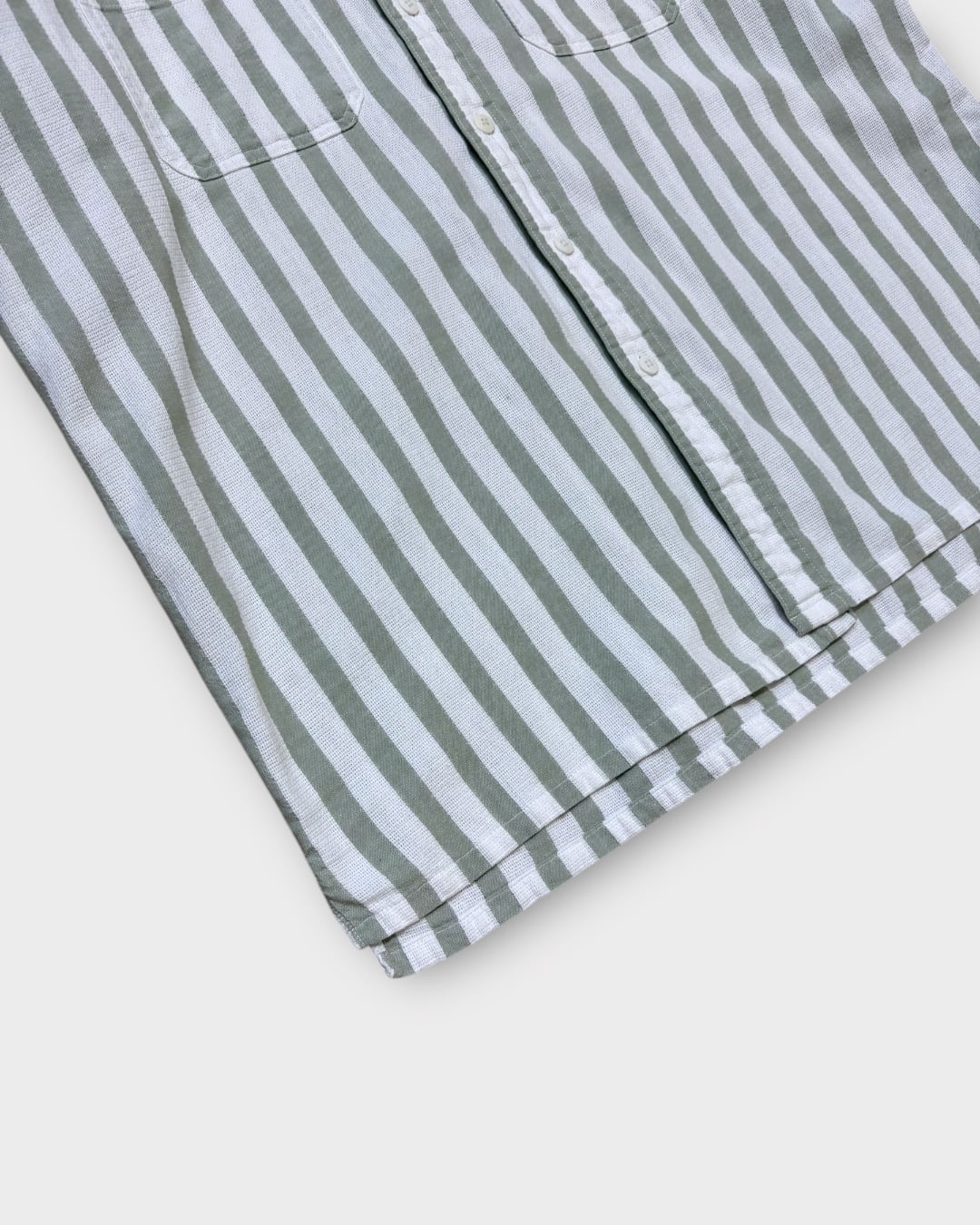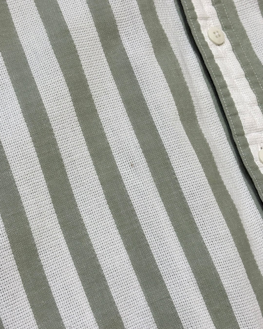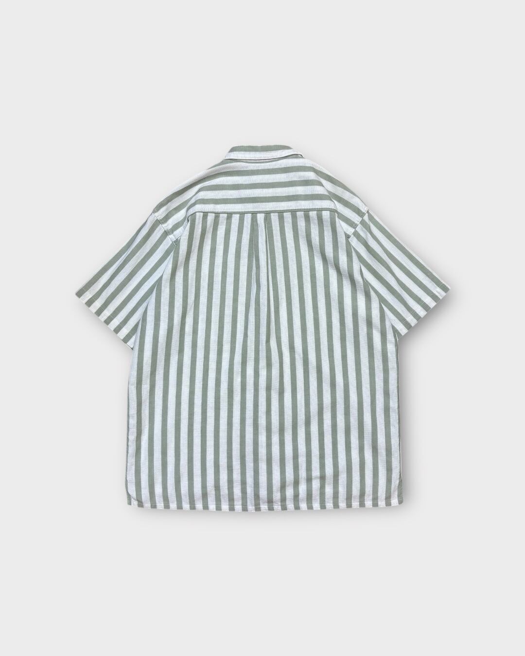 淡いカーキグリーンとホワイトのストライプが清涼感たっぷりで、春夏の装いにぴったりな1枚です。