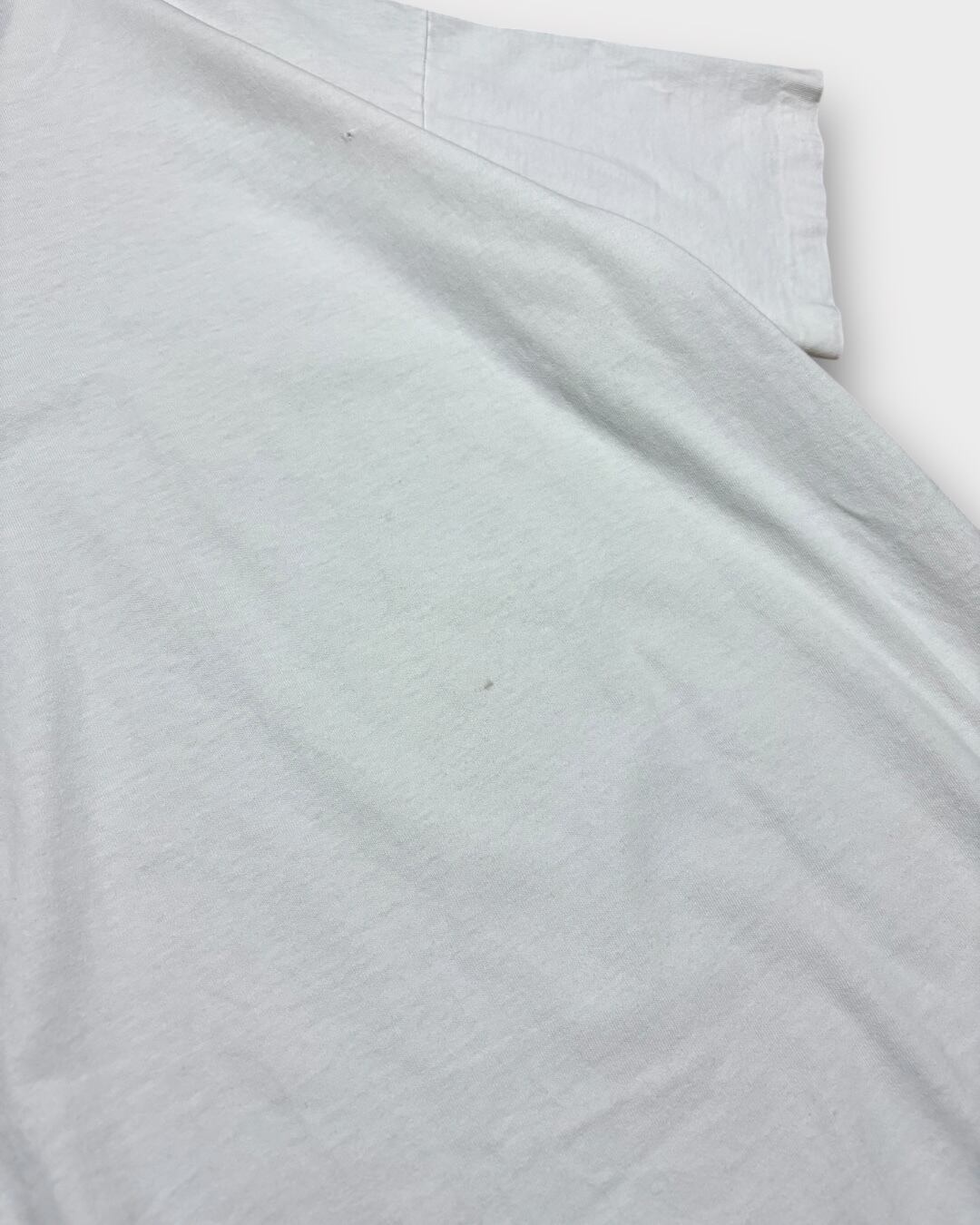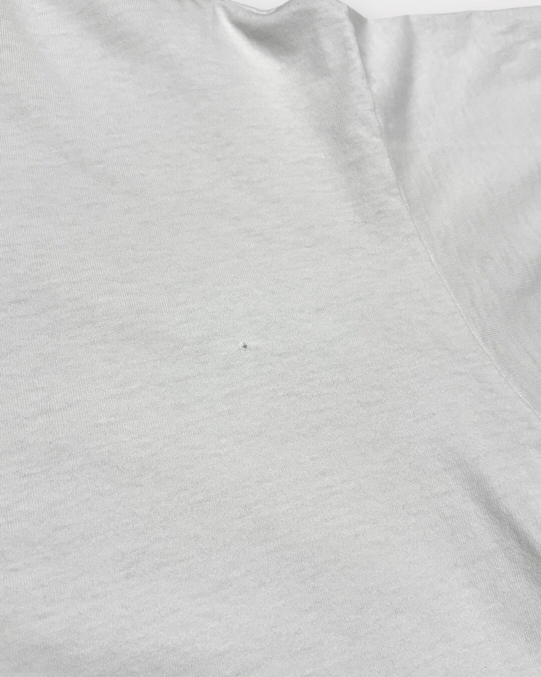 ボディはFRUIT OF THE LOOM製のMADE IN USA。しっかりとした生地感で、サイズはXL表記。背面に小さな穴と薄いシミがありますが、全体として着用に支障のない範囲です。