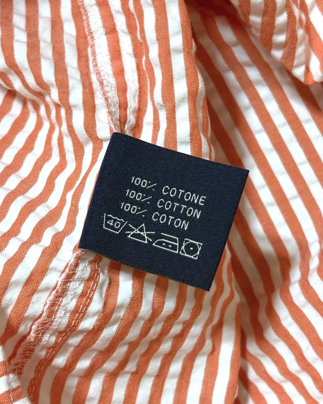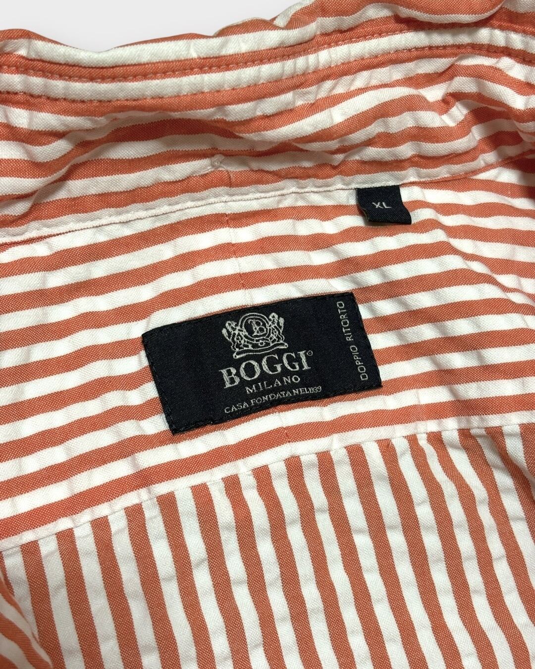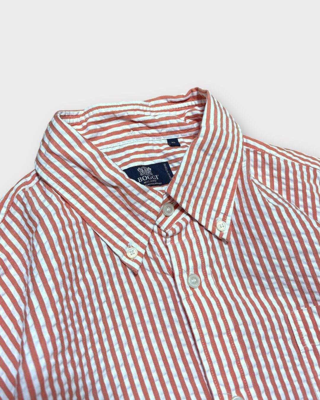 イタリア・ミラノのブランド、BOGGI MILANOのボタンダウンシャツ。鮮やかなオレンジ×ホワイトのストライプに、独特の凹凸感が魅力のシアサッカー生地を採用した一枚です。