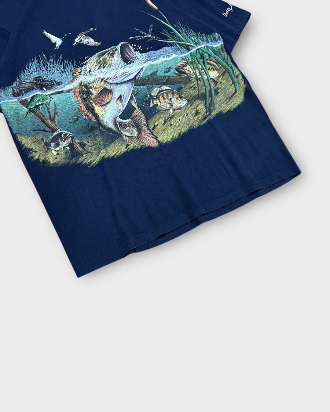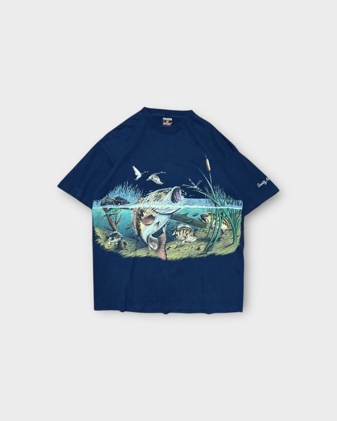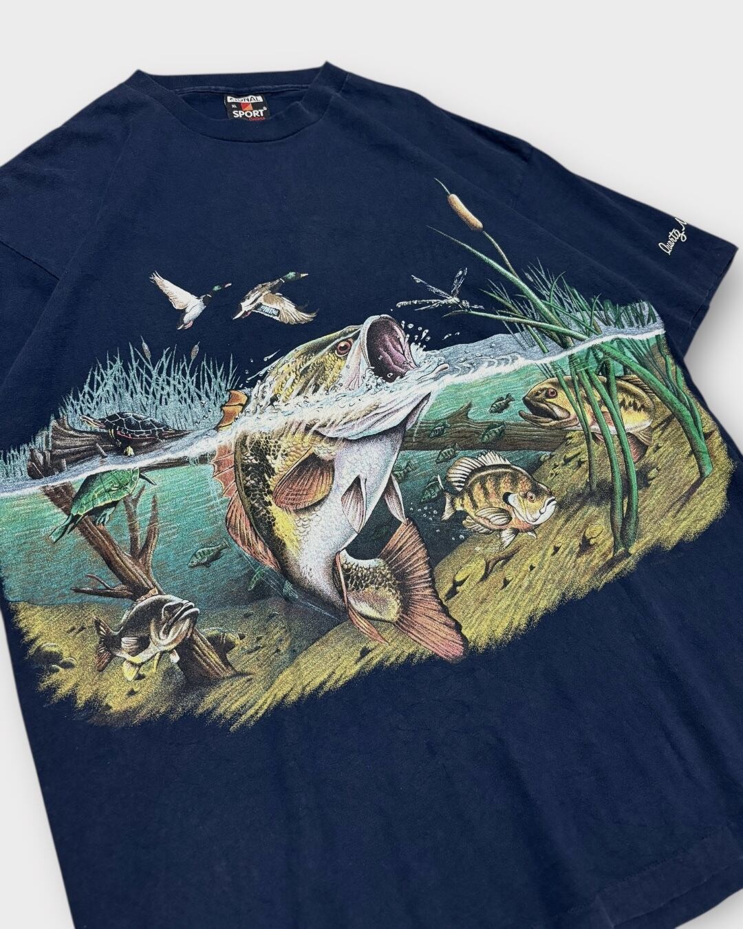 【VINTAGE】1990’s “SIGNAL SPORT” Fishing Graphic T-Shirt Navy MADE IN USA
