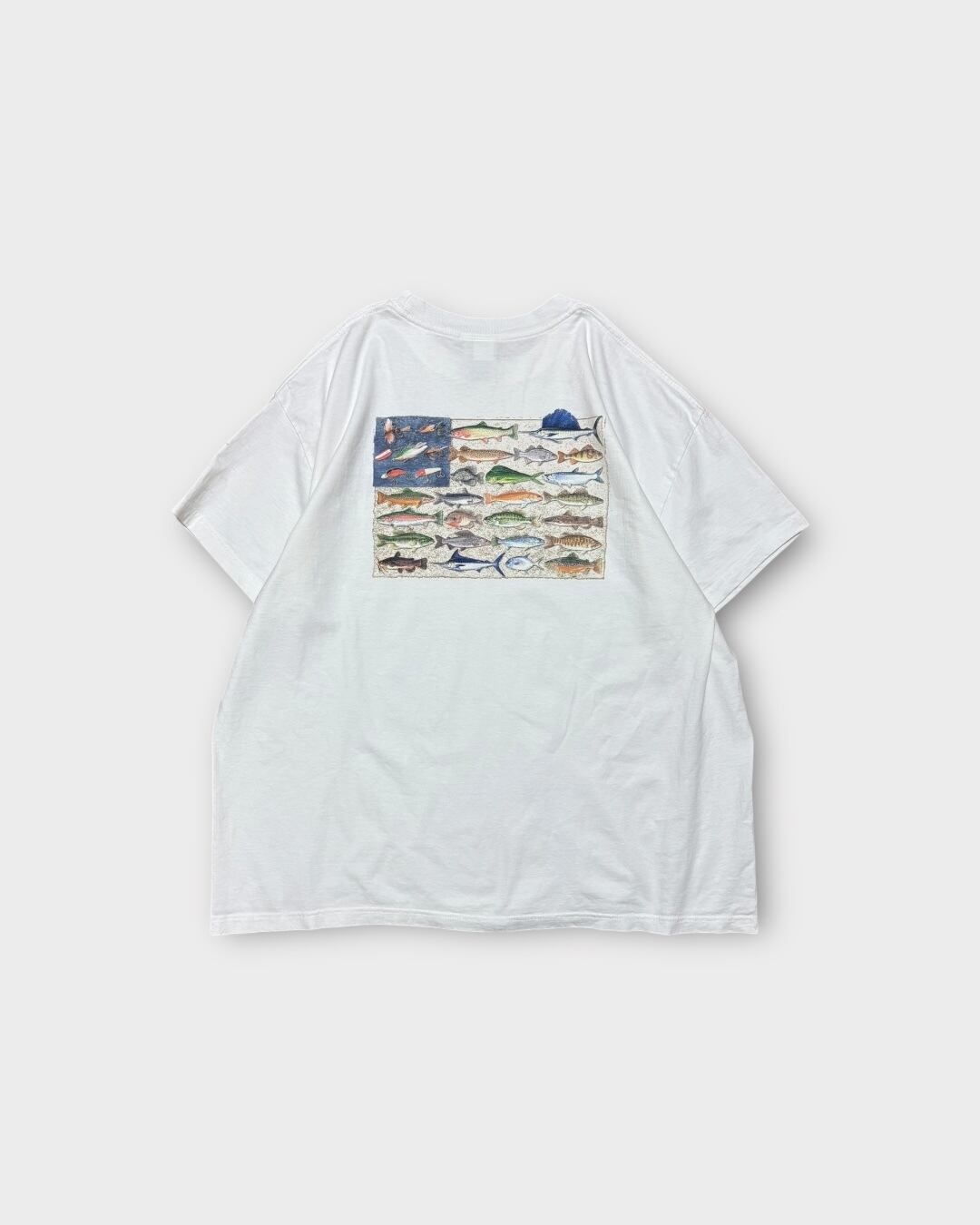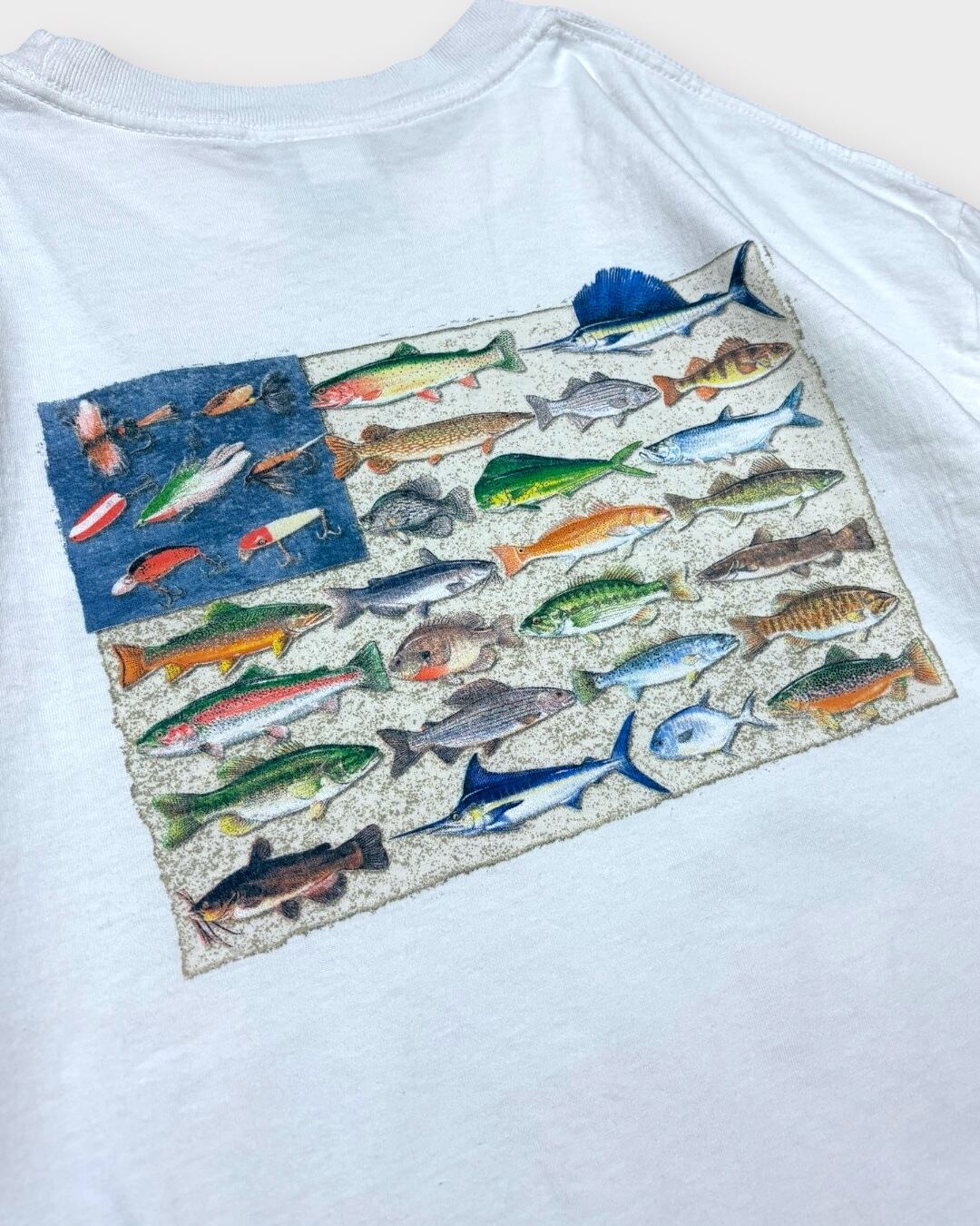 フロントにはロゴプリント、そしてバックにはアメリカ国旗モチーフにさまざまな魚が描かれたユニークなグラフィックが入ります。