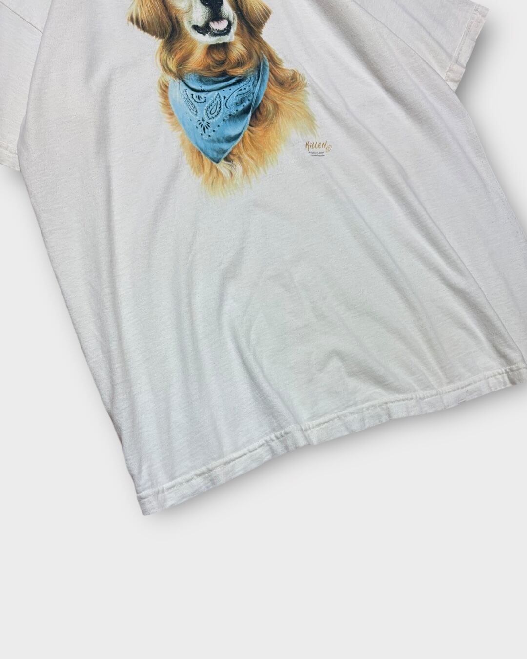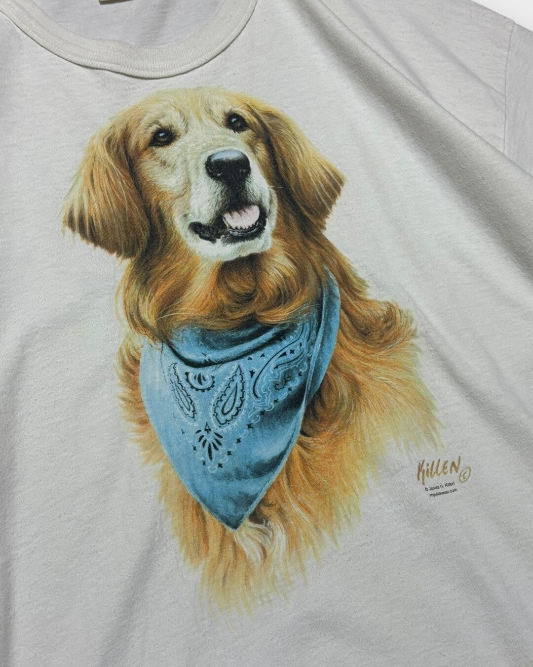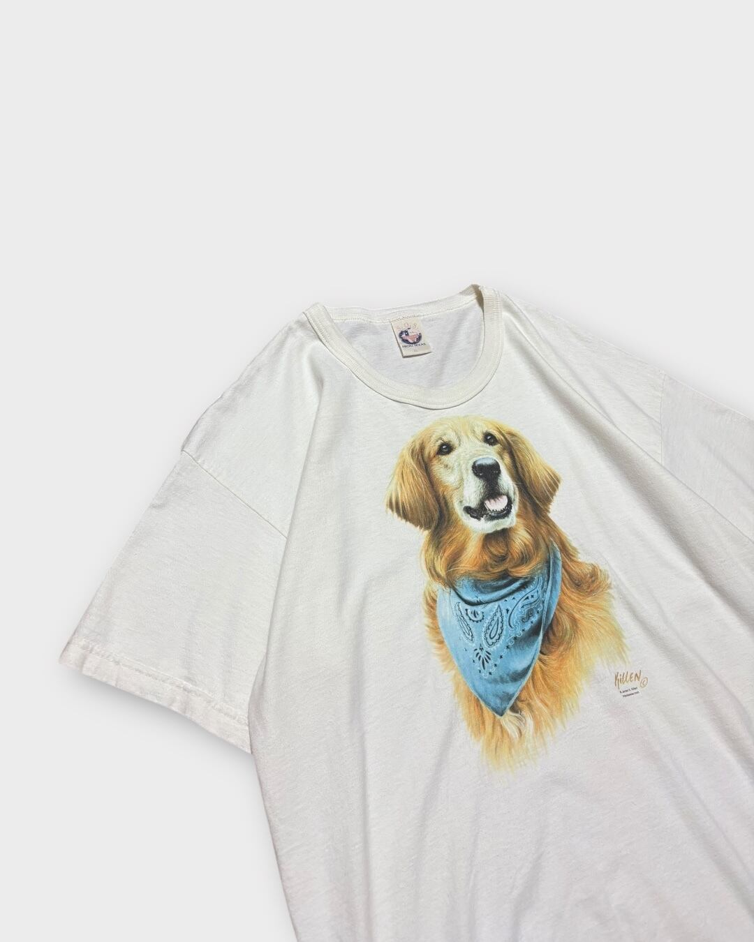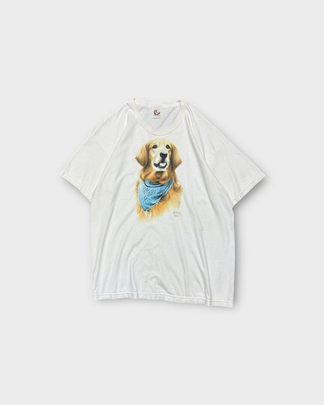 バンダナを巻いたゴールデンレトリバーのリアルなプリントが魅力的なアニマルTシャツ。