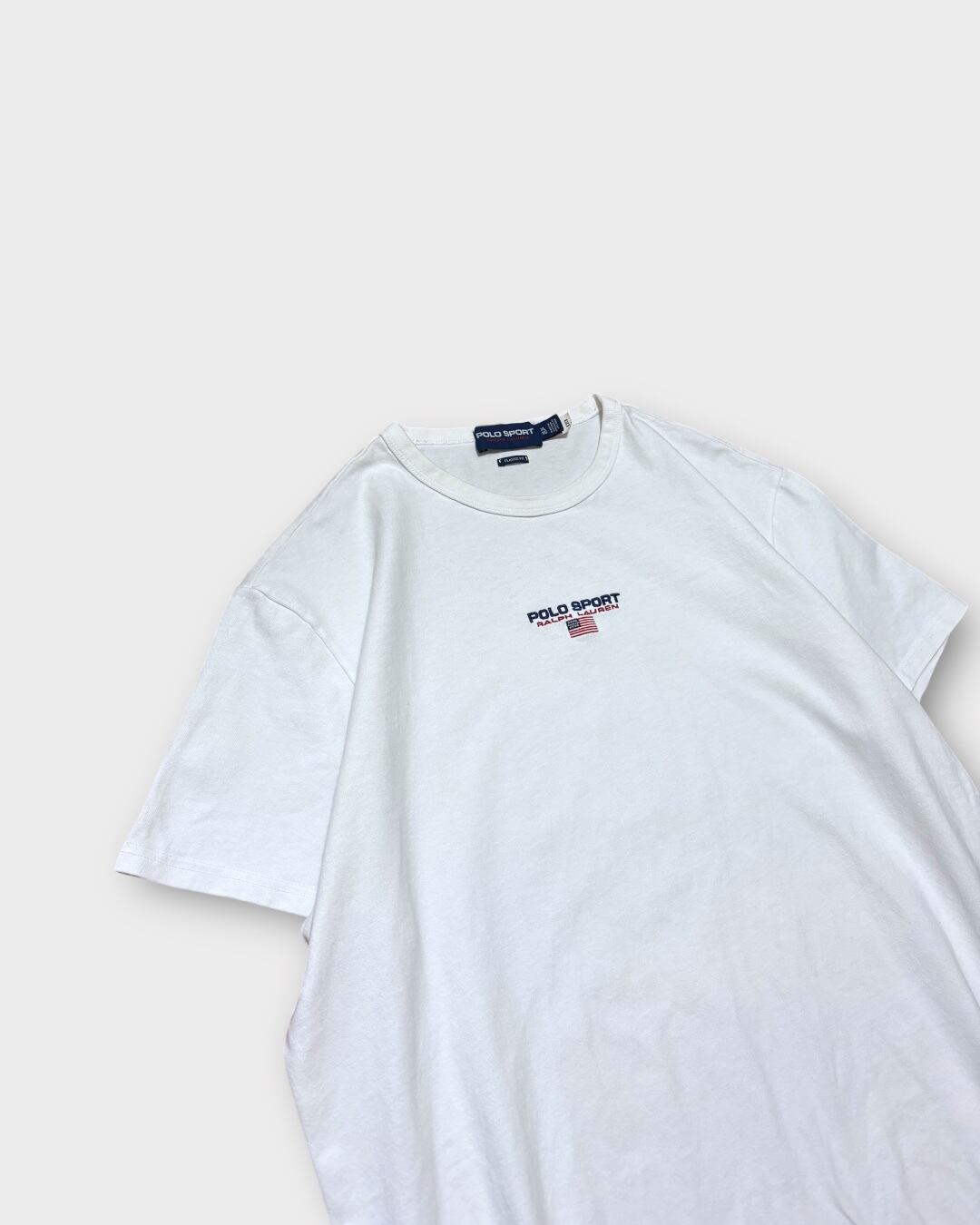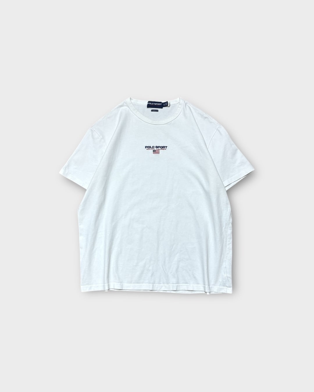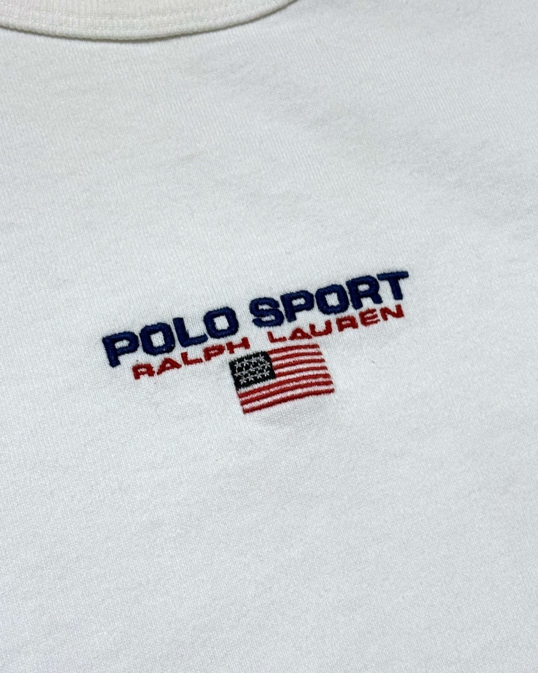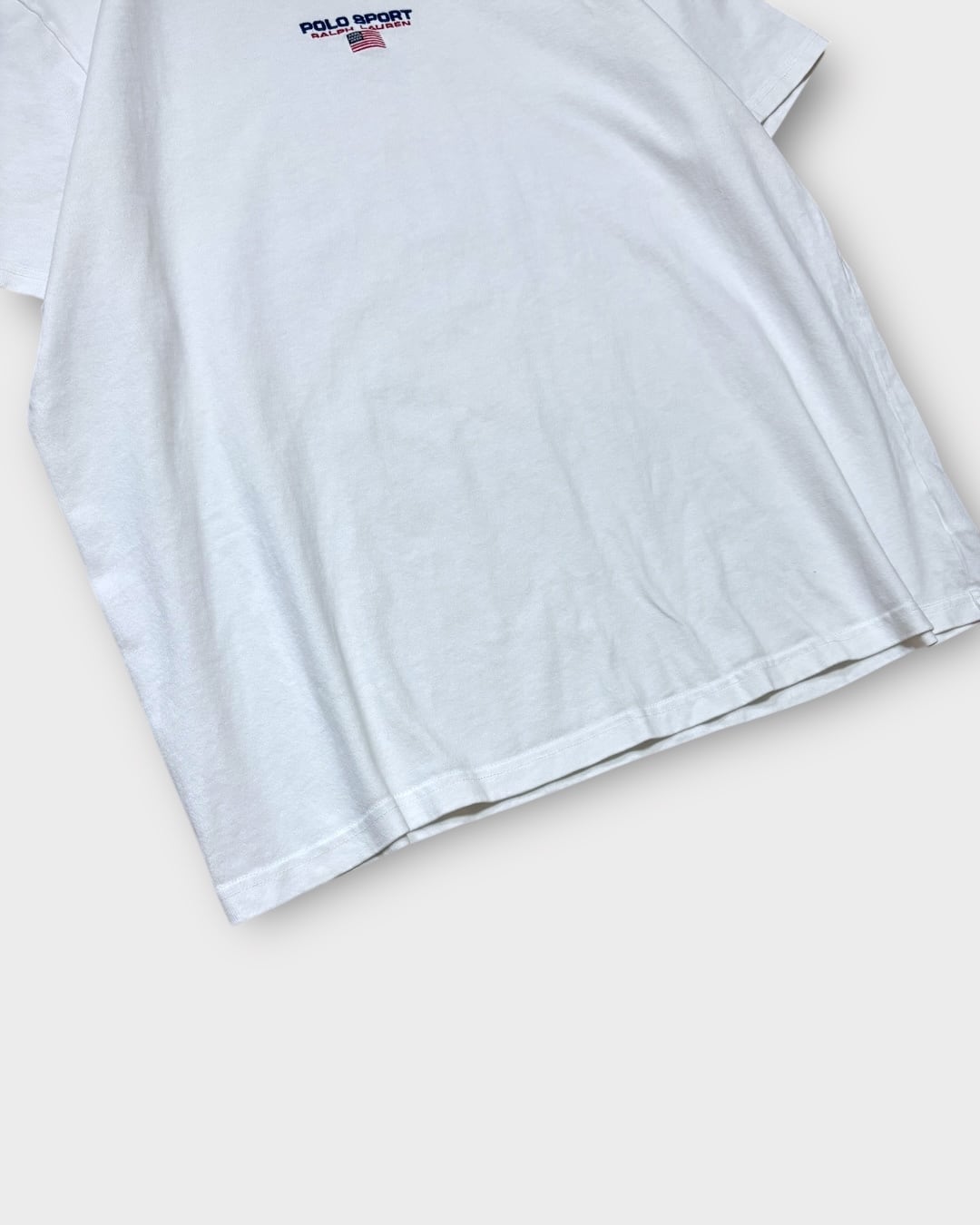 胸元に「POLO SPORT RALPH LAUREN」とアメリカ国旗が丁寧に刺繍されたミニマルなデザインで、シンプルながら印象的な一枚です。