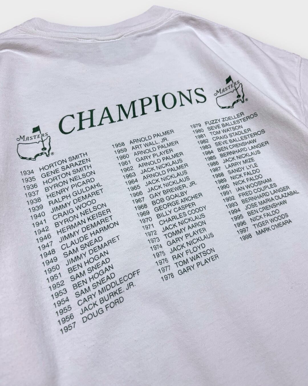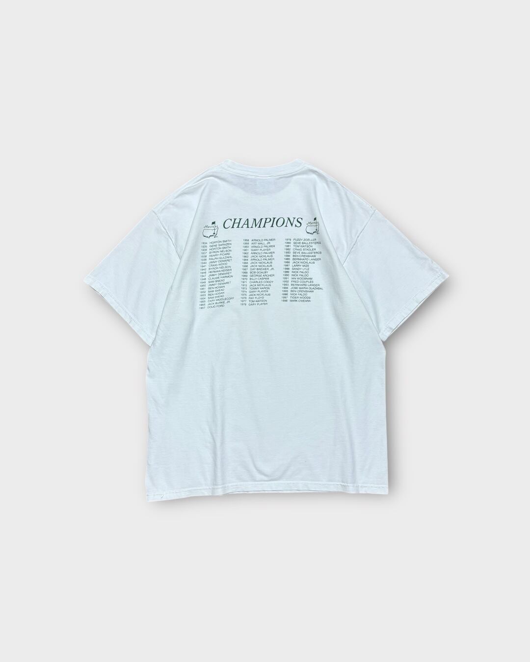 ゴルフの四大大会のひとつ「マスターズ」の公式Tシャツ。1999年大会モデルで、フロントには年号入りのロゴ、バックには1934年から1998年までの歴代優勝者がびっしりと並んだ迫力のあるプリントです。