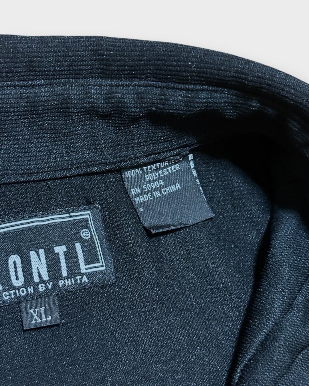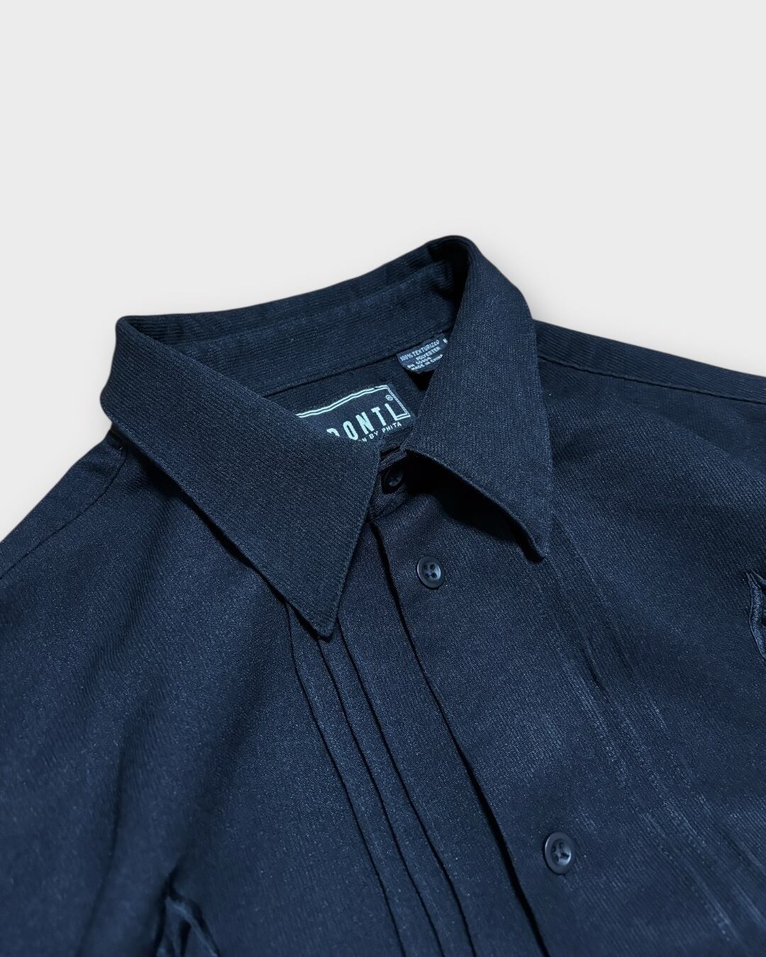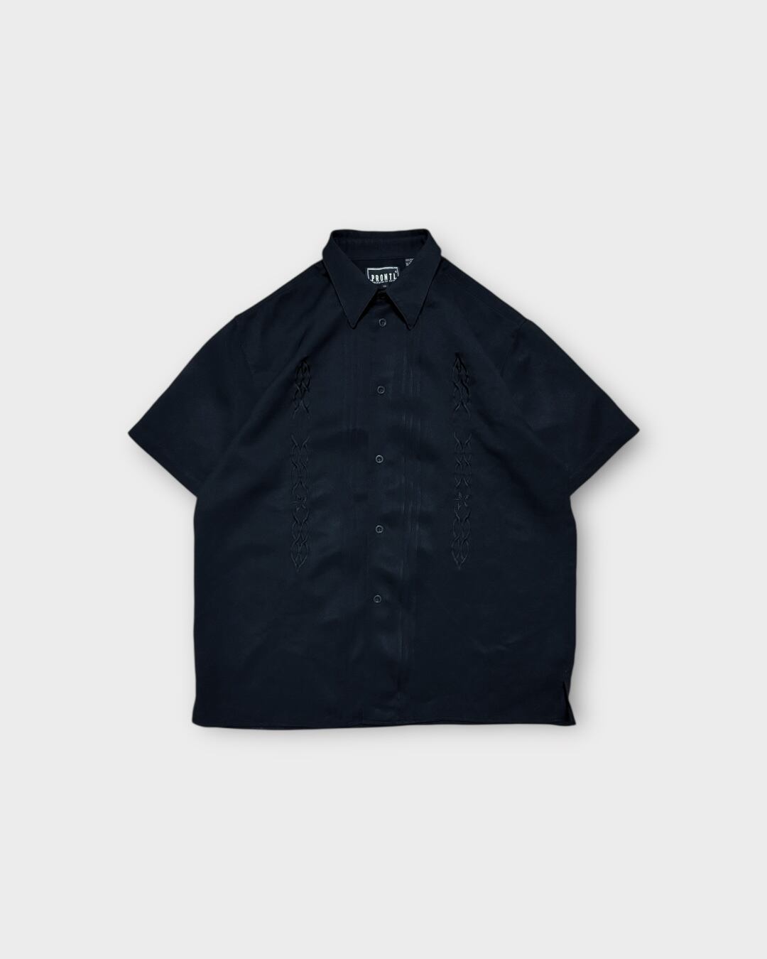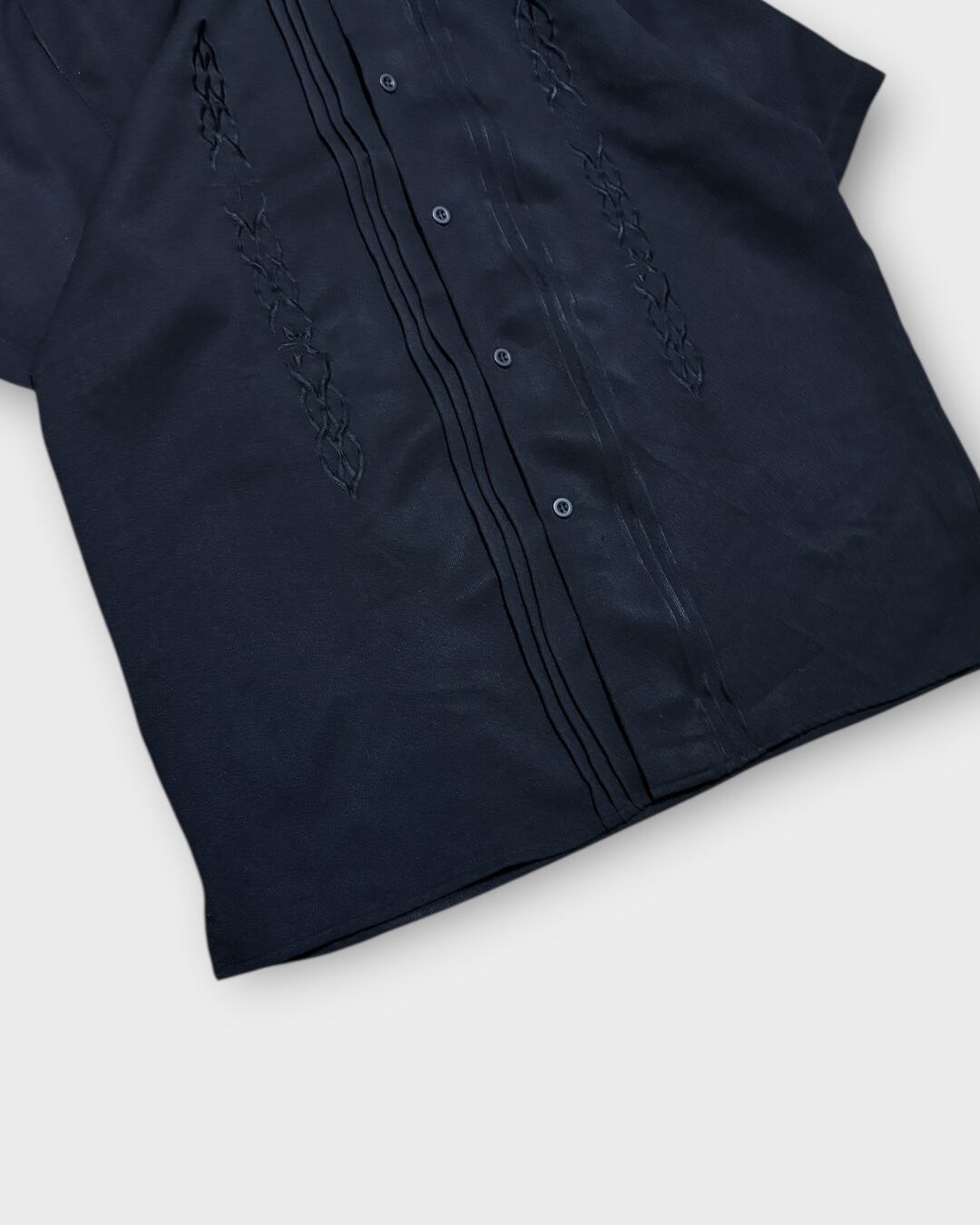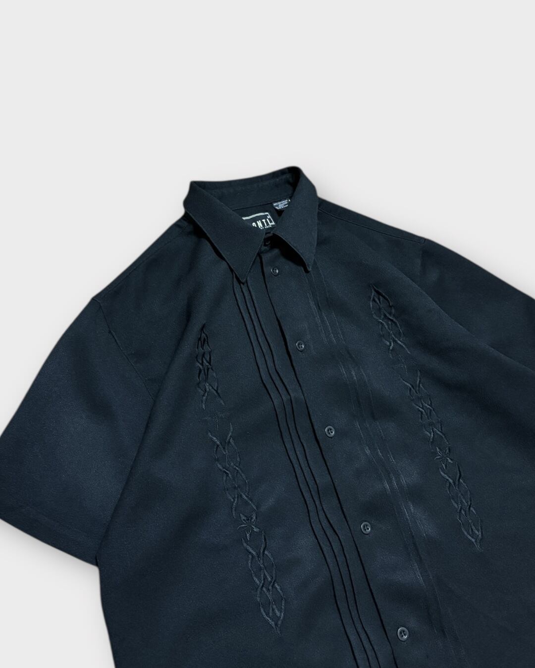 フロントに立体感ある刺繍とプリーツを施した、キューバシャツ風デザインの一枚。カラーはオールブラックで、光の当たり方によって程よい艶を感じられる表情です。