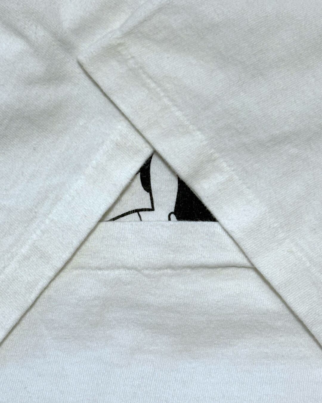 1990年代製、MADE IN USAのHanes HEAVYWEIGHTボディを使用したプリントTシャツ。ジャズ・スウィングの世界観をユーモラスに描いたグラフィックが特徴です。しっかりとした厚みのある生地感、シングルステッチ仕様で、古着好きにはたまらない雰囲気の一枚。フロントに薄いシミがございますが、全体の雰囲気を損ねるものではなく、ヴィンテージらしい風合いとして楽しんでいただけます。