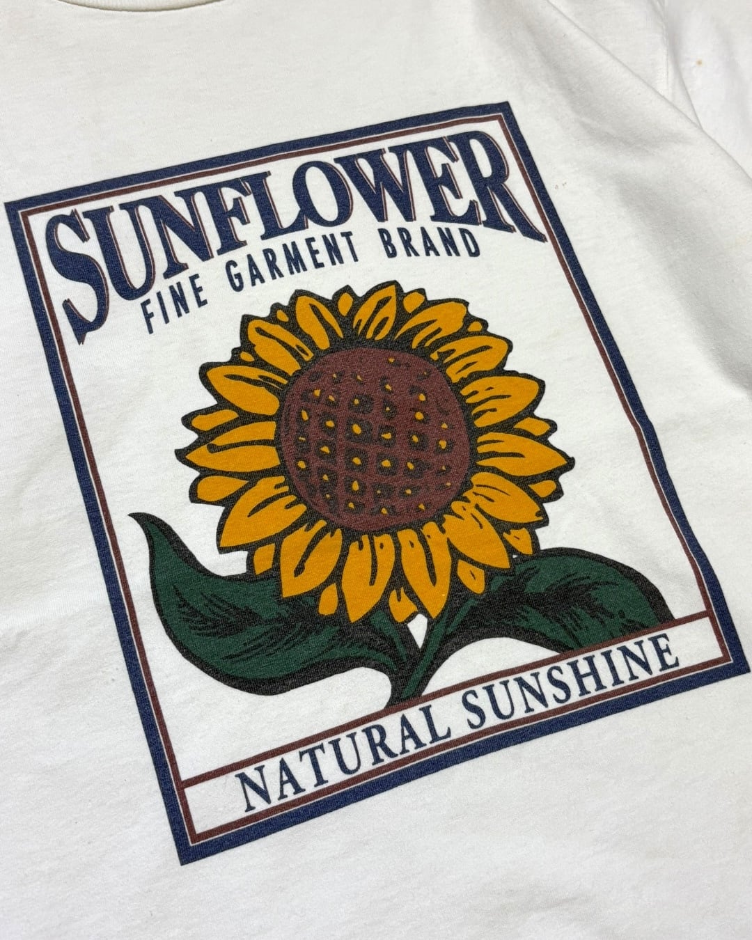 「SUNFLOWER」「NATURAL SUNSHINE」の文字とともに、鮮やかなひまわりのデザインが目を引く一枚です。