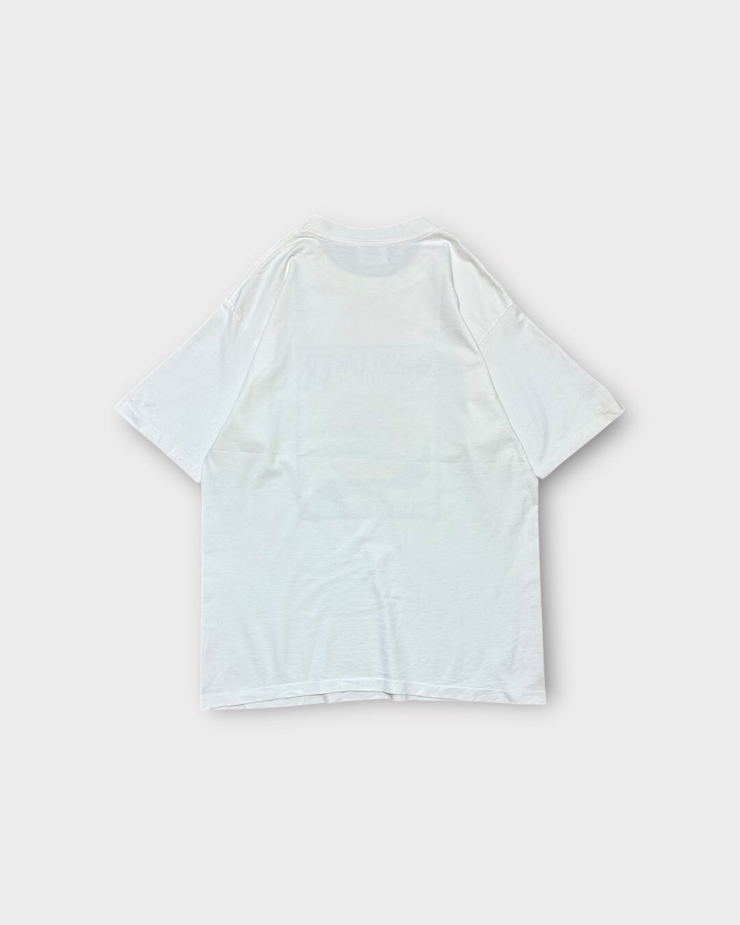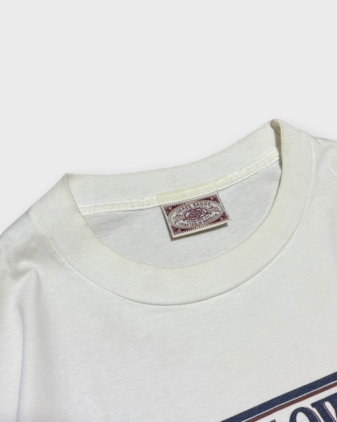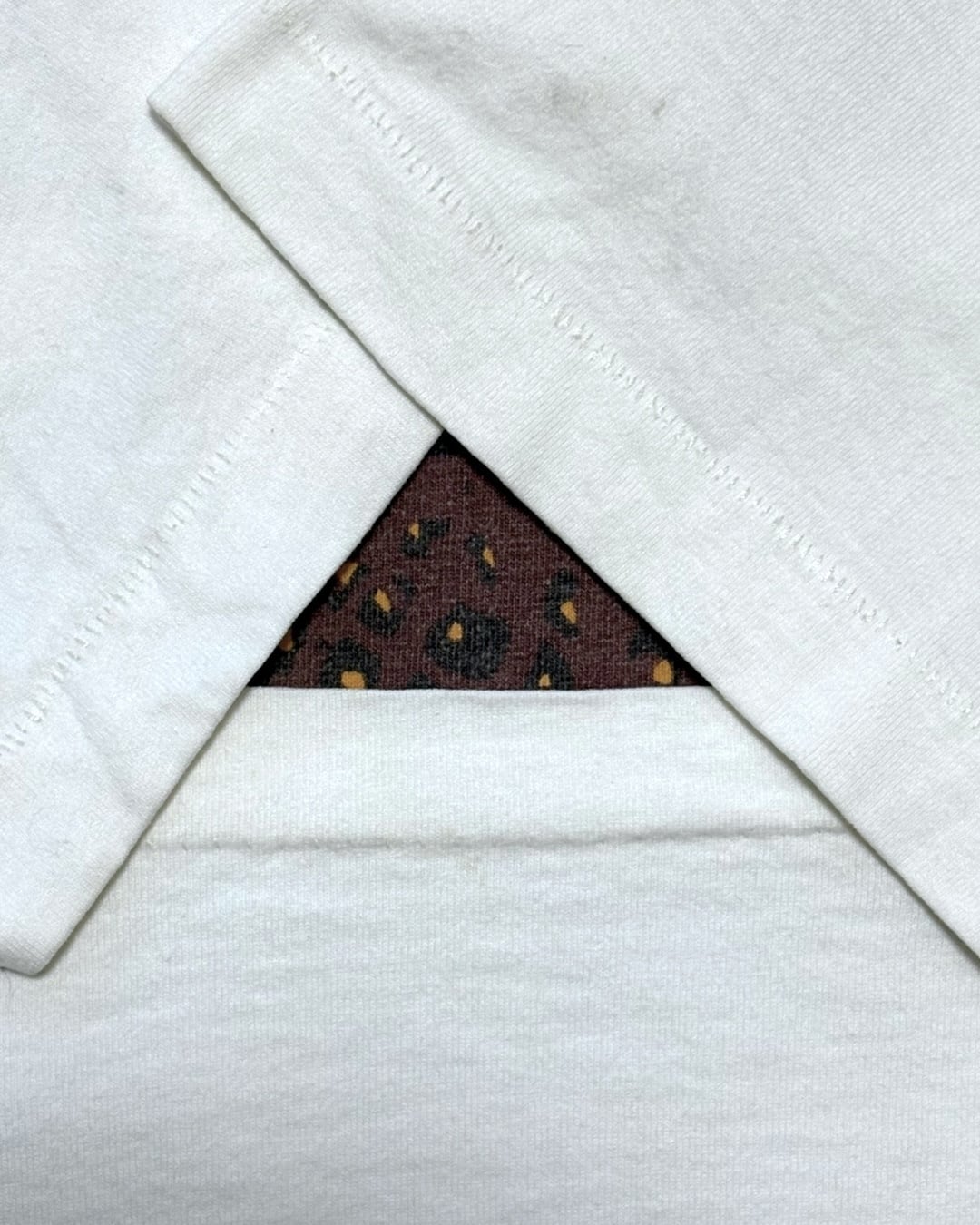 白に近いオフホワイトのボディに、アートピースのようなグラフィックが映えるデザイン。しっかりとした厚みのコットン素材で、シングルステッチ仕様。