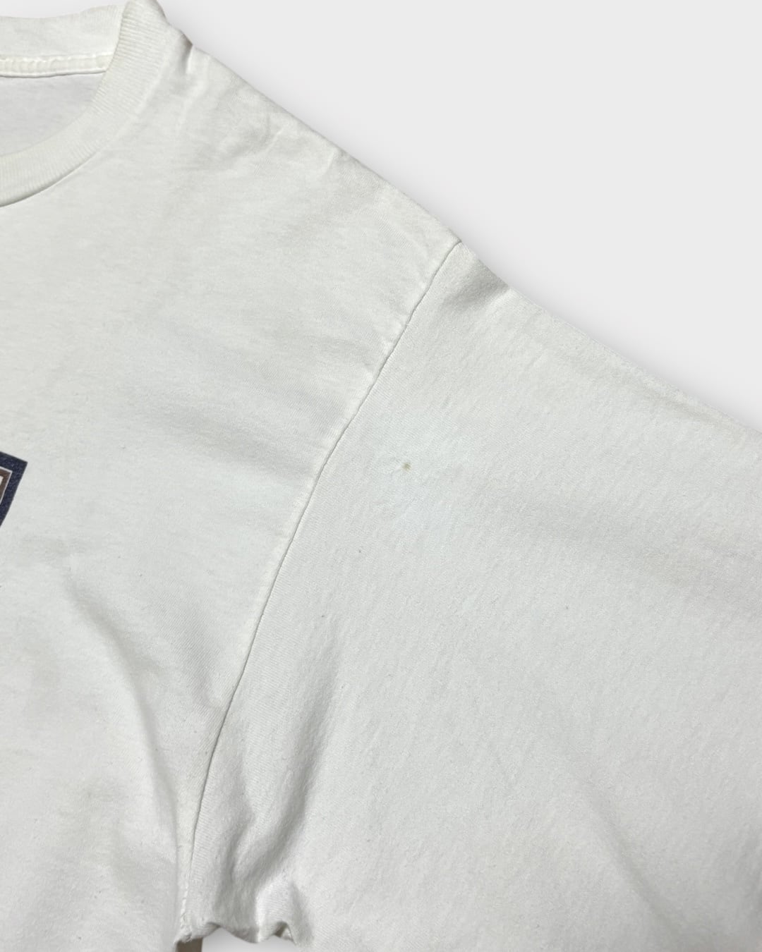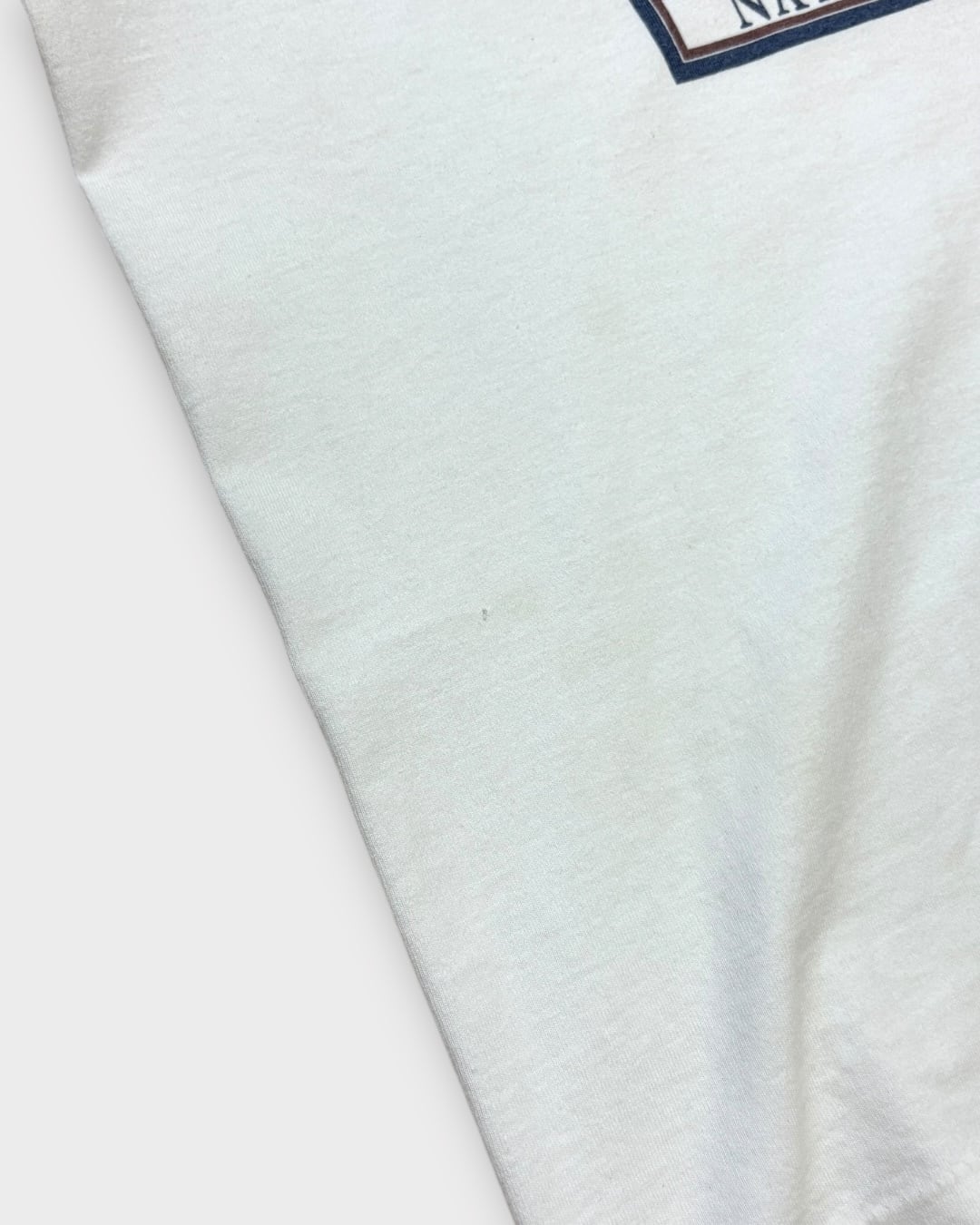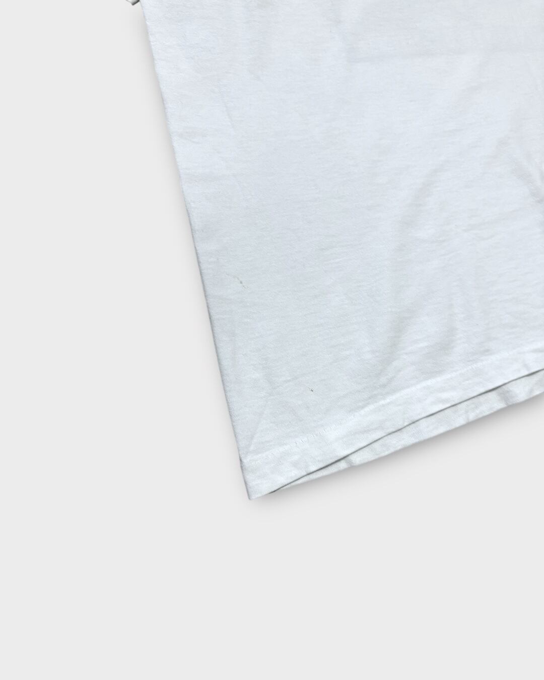 白に近いオフホワイトのボディに、アートピースのようなグラフィックが映えるデザイン。しっかりとした厚みのコットン素材で、シングルステッチ仕様。