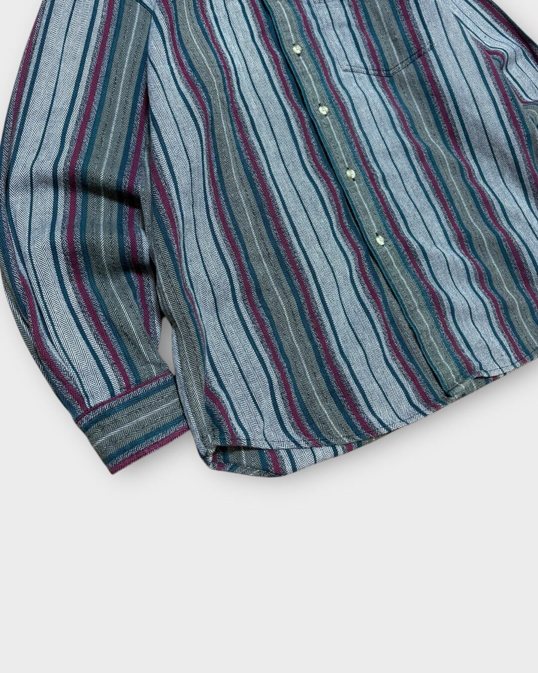 太めのピッチで構成された多色ストライプに加え、ヘリンボーン織の立体感が特徴的な一枚。