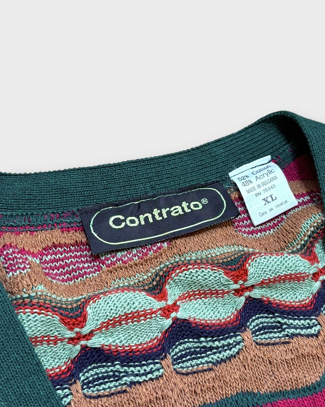 グリーンをベースに、立体的な編み柄と鮮やかな配色が際立つ一枚。