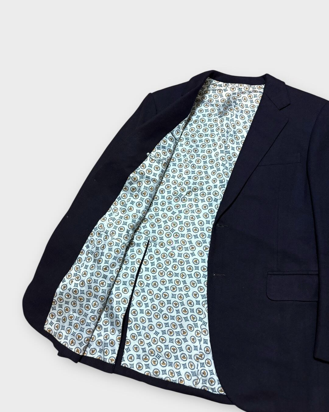 さらに総裏地にはライトブルーを基調にしたクラシックな柄を配し、脱いだ時にも印象的な佇まいを演出します。