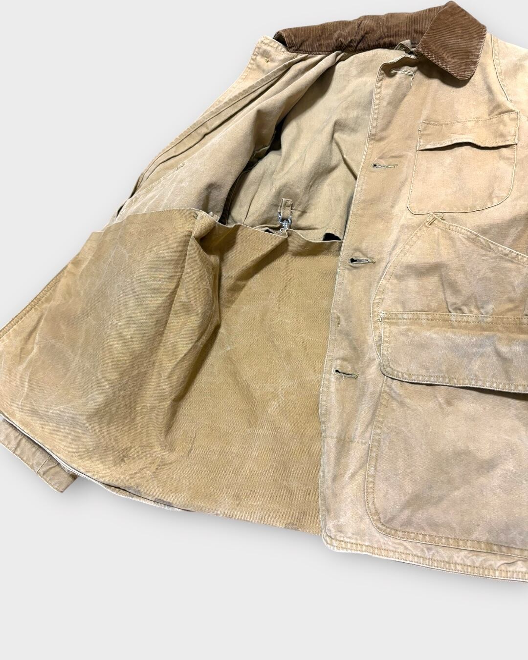 肉厚なキャンバス地にブラウンコーデュロイの襟を組み合わせた無骨なデザインで、フロントには大容量ポケット、背面にはゲームポケットを備えた実用的な仕様。