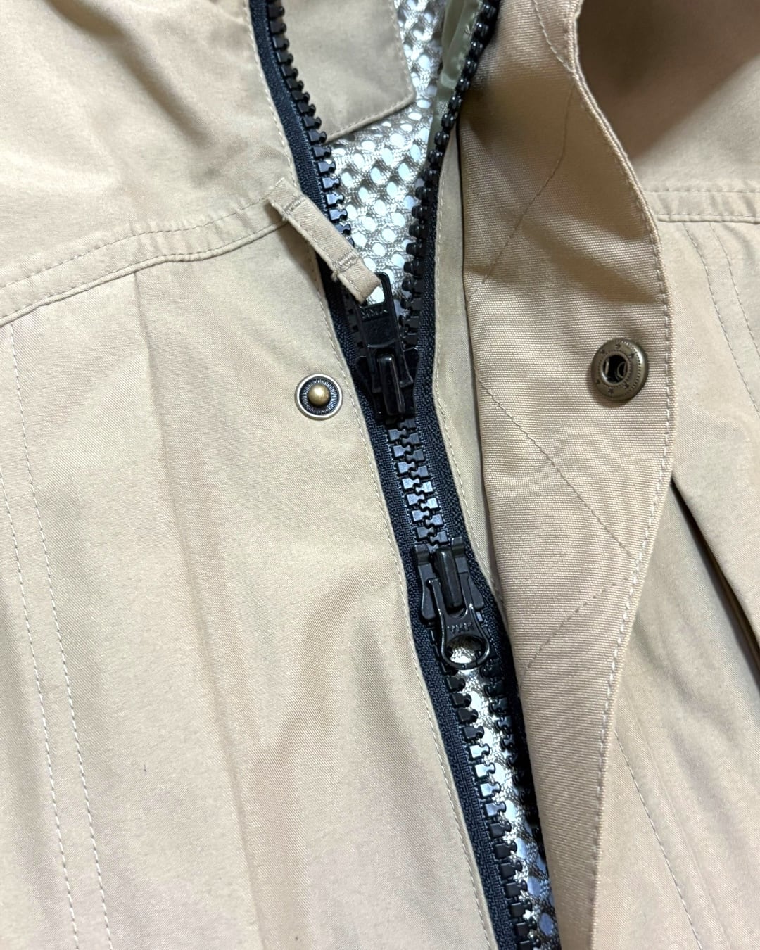 フロントはダブルジップとスナップの前立て、大容量の4ポケットを備えた機能的な仕様。
