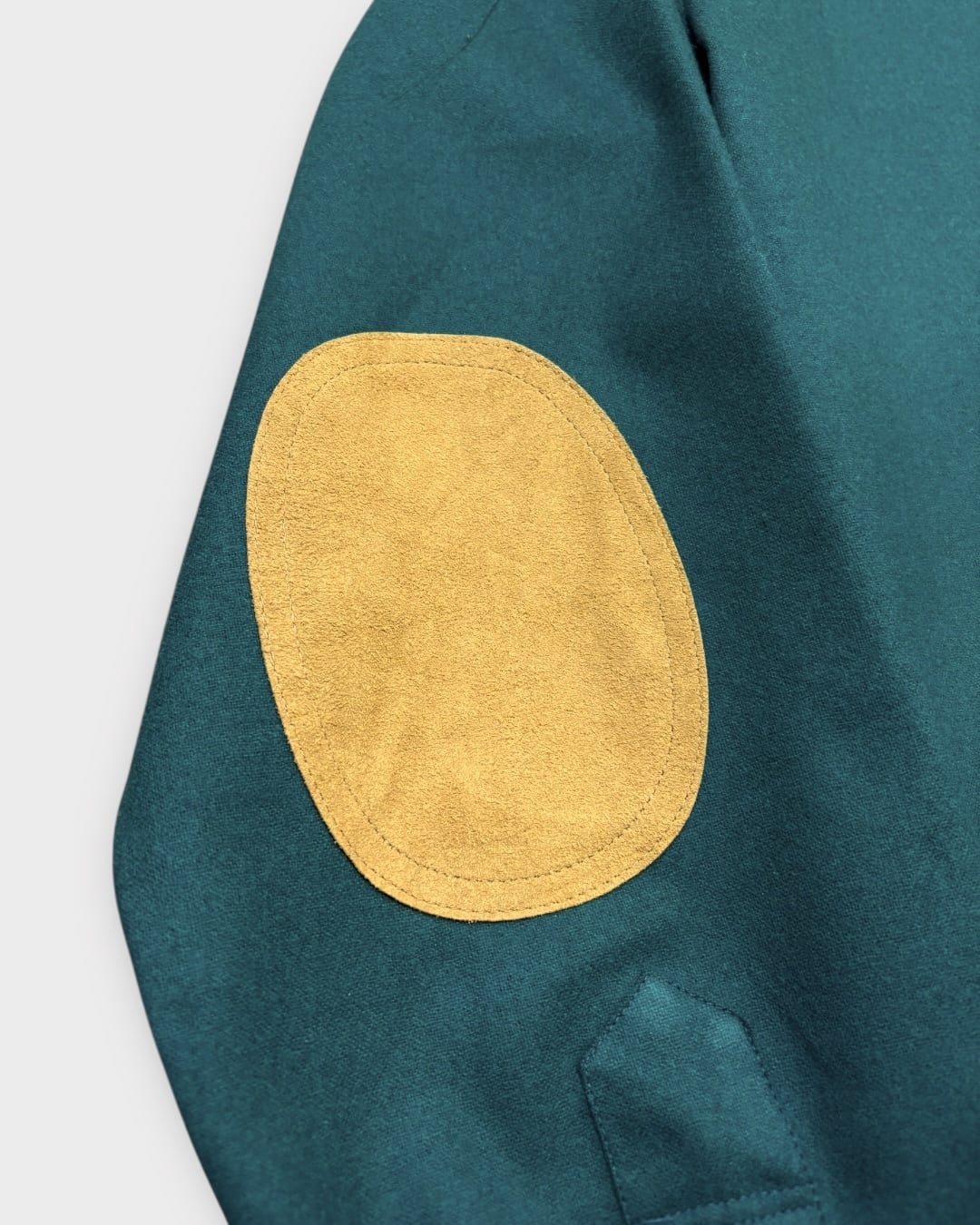 ベージュのスエードエルボーパッチを配したクラシックなディテール