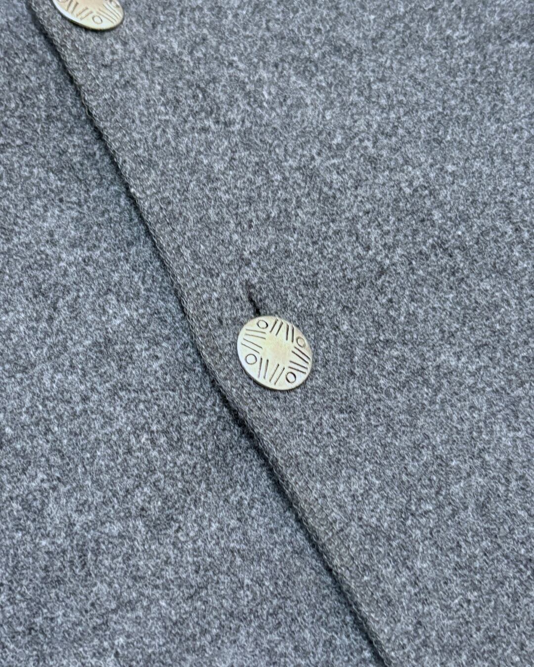 ダークグレーを基調としたシンプルな無地で、ラペルカラーにメタル調ボタンを組み合わせたクラシカルな一着です。
