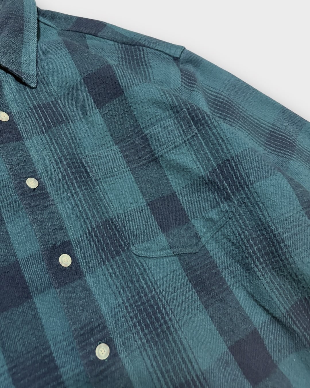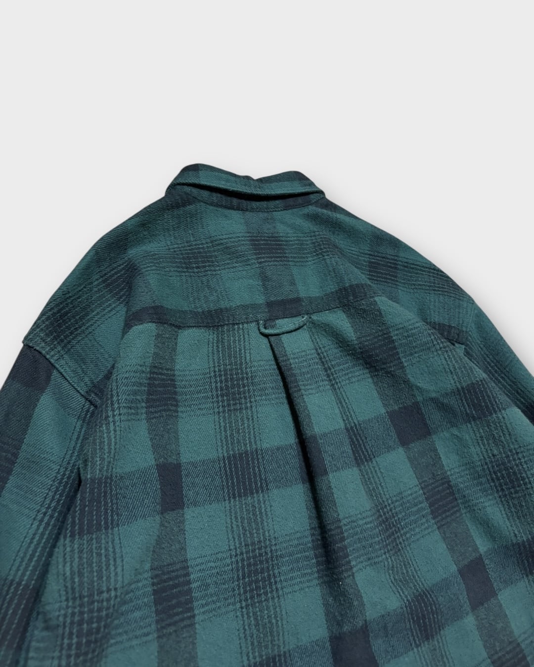 深みのあるグリーン×ブラックの落ち着いたチェックパターンが印象的な一枚。
