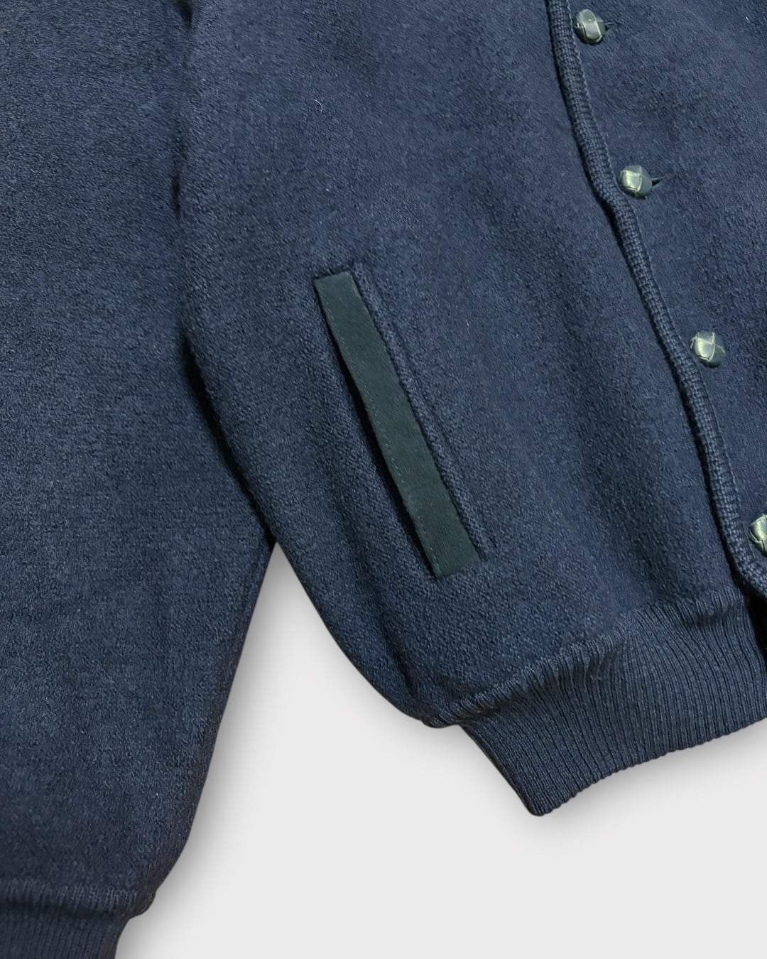 深いネイビーボディに同系色のライン切り替えとクラシックなフロントボタンが映えるシンプルながら品のあるデザインです。