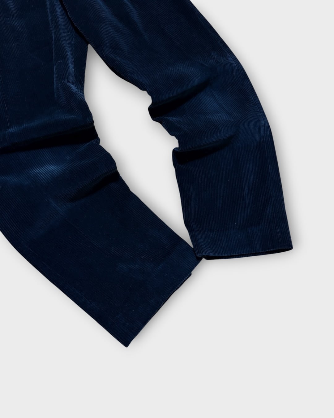 深みのあるネイビーカラーに上品な光沢感を備えた太畝コーデュロイは、見る角度によって豊かな表情を見せ、高級感を演出。