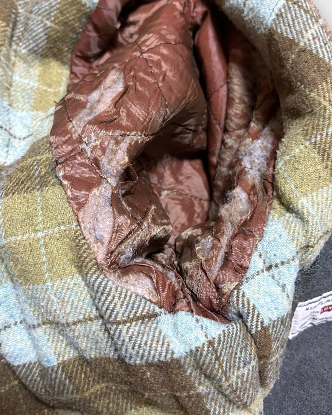 裏地はブラウン×ライトブルーのチェックウールで、保温性と存在感を兼ね備えています。