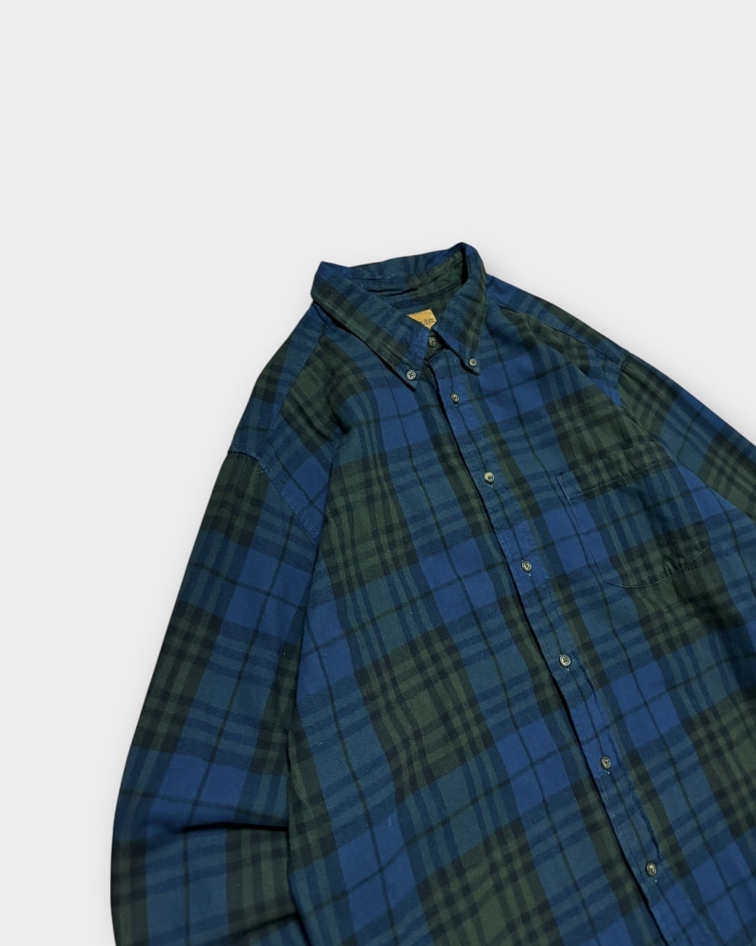 深みのあるネイビーとグリーンで構成された、ブラックウォッチ調のチェックパターンが印象的。