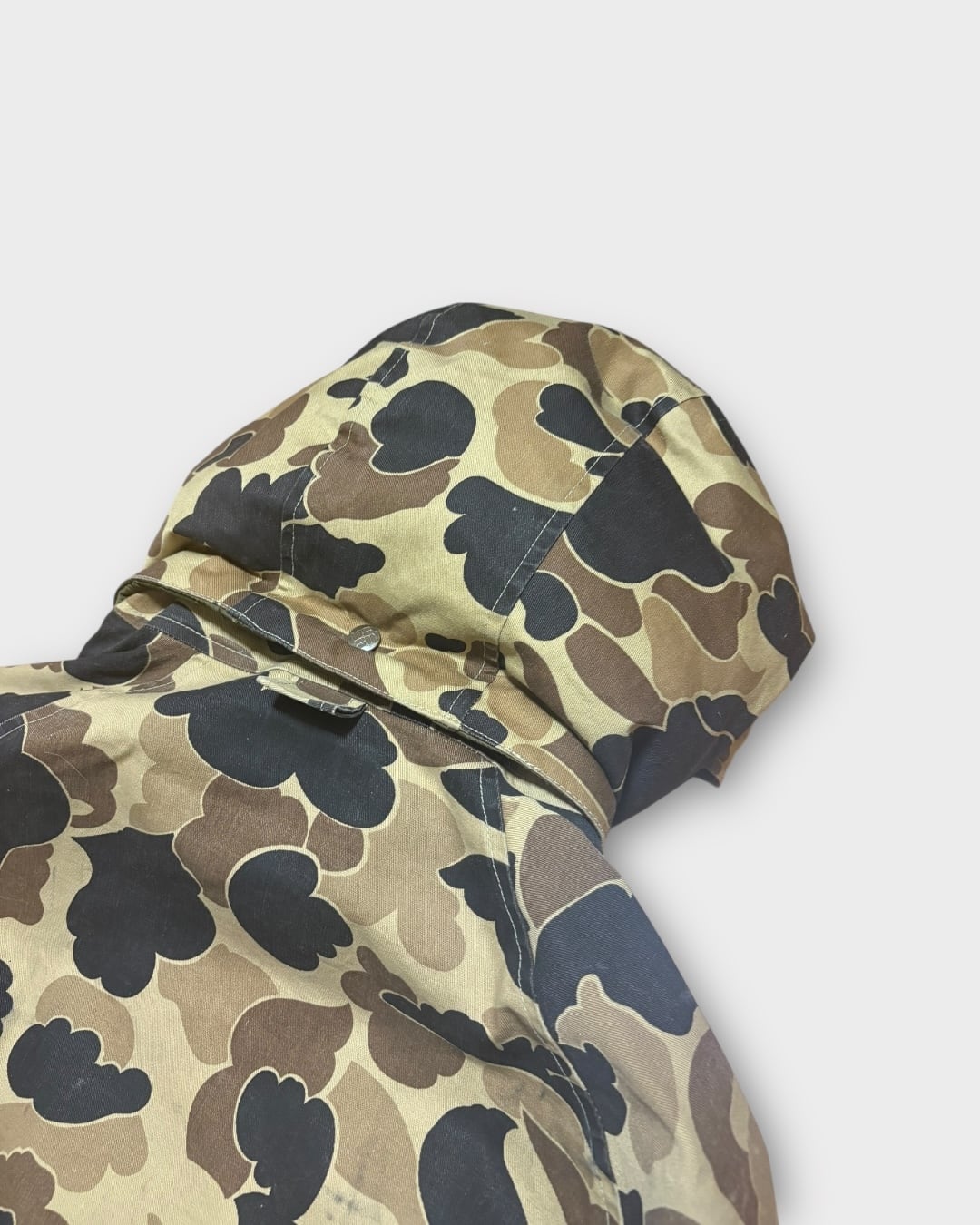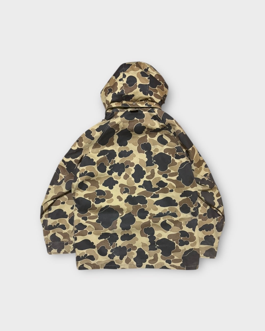 ブラウンのダックカモフラージュ柄に、取り外し可能なフードと4ポケットデザインを備えた一着。