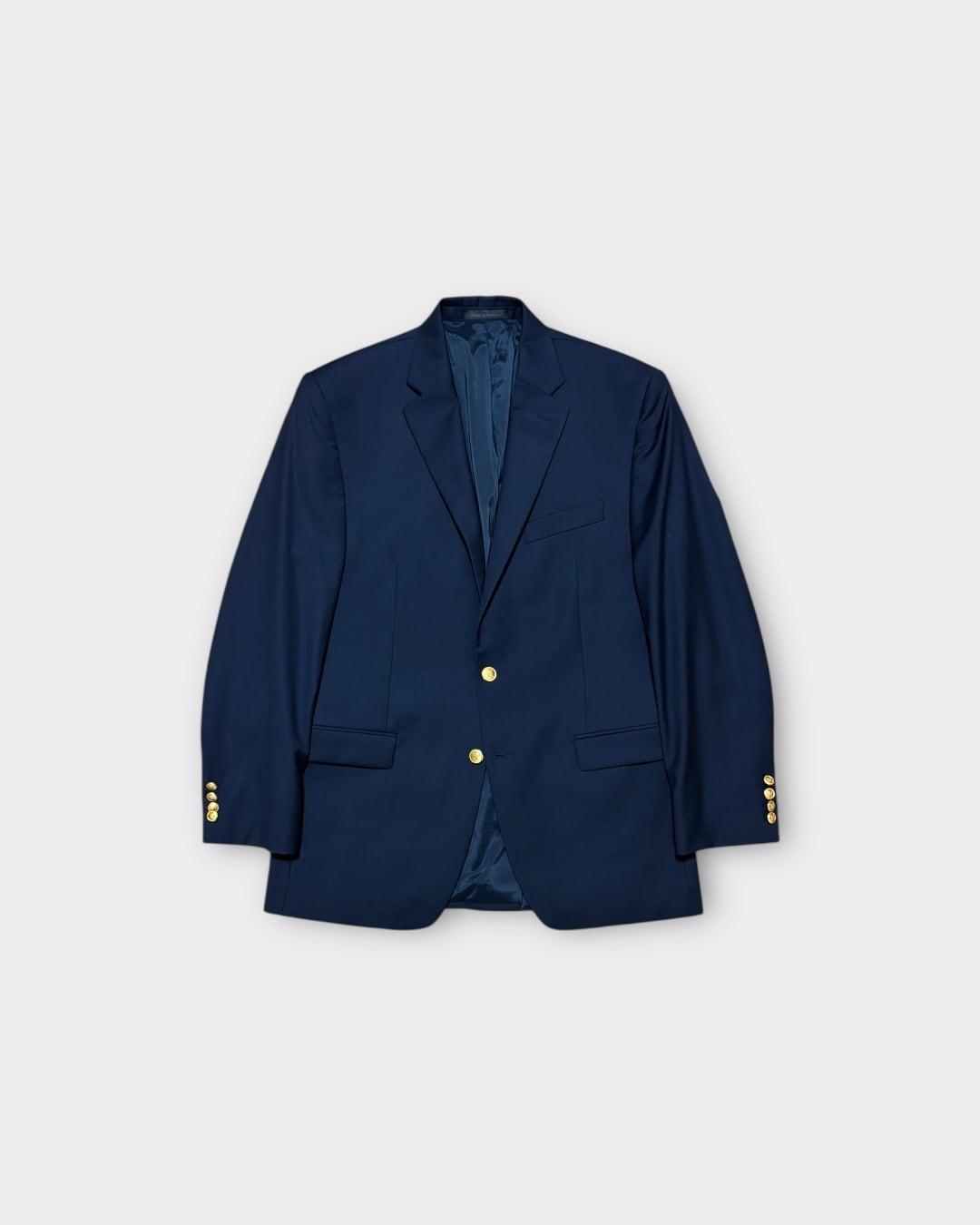 ネイビー × 金ボタンのトラディショナルな組み合わせが魅力の一着です。