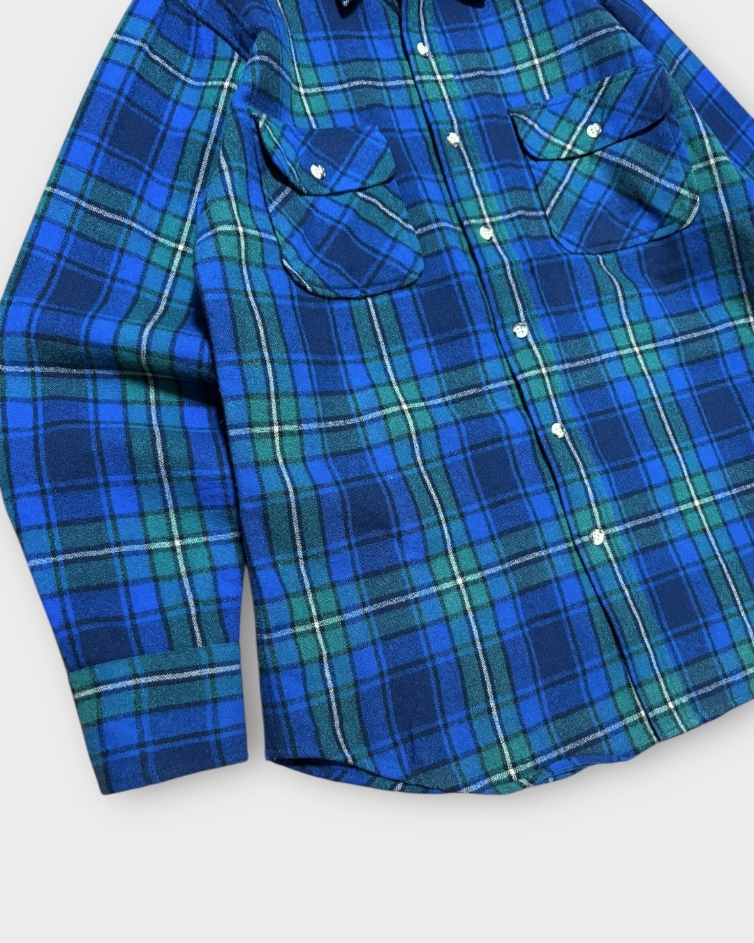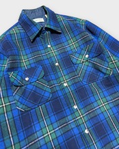 発色の良いロイヤルブルー×グリーンのタータンチェックが目を引く一枚。