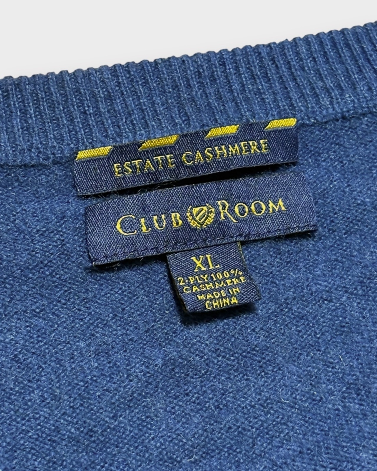 くすみブルーの上品なトーンが特徴で、Vネックの程よい開きがクラシックな印象。