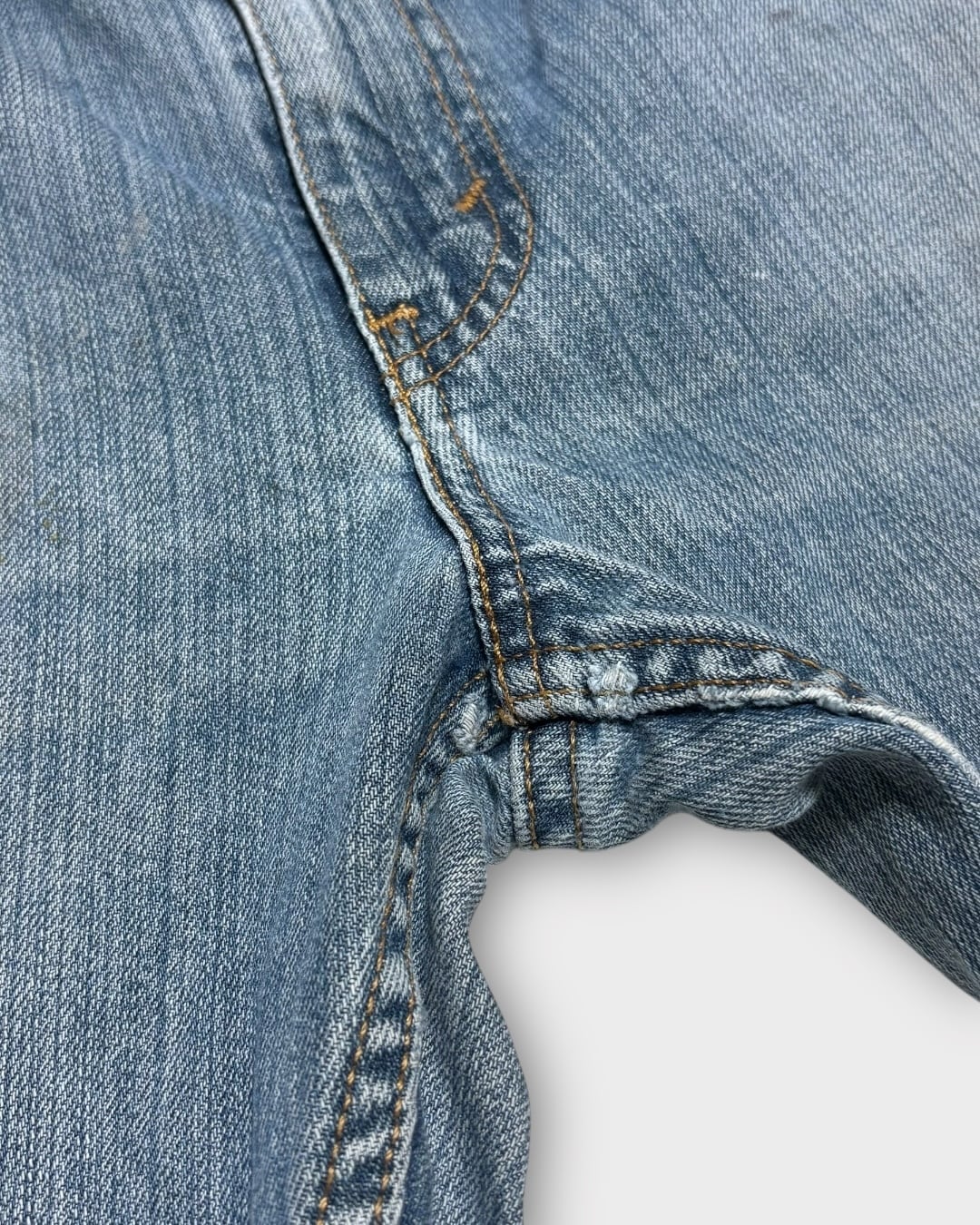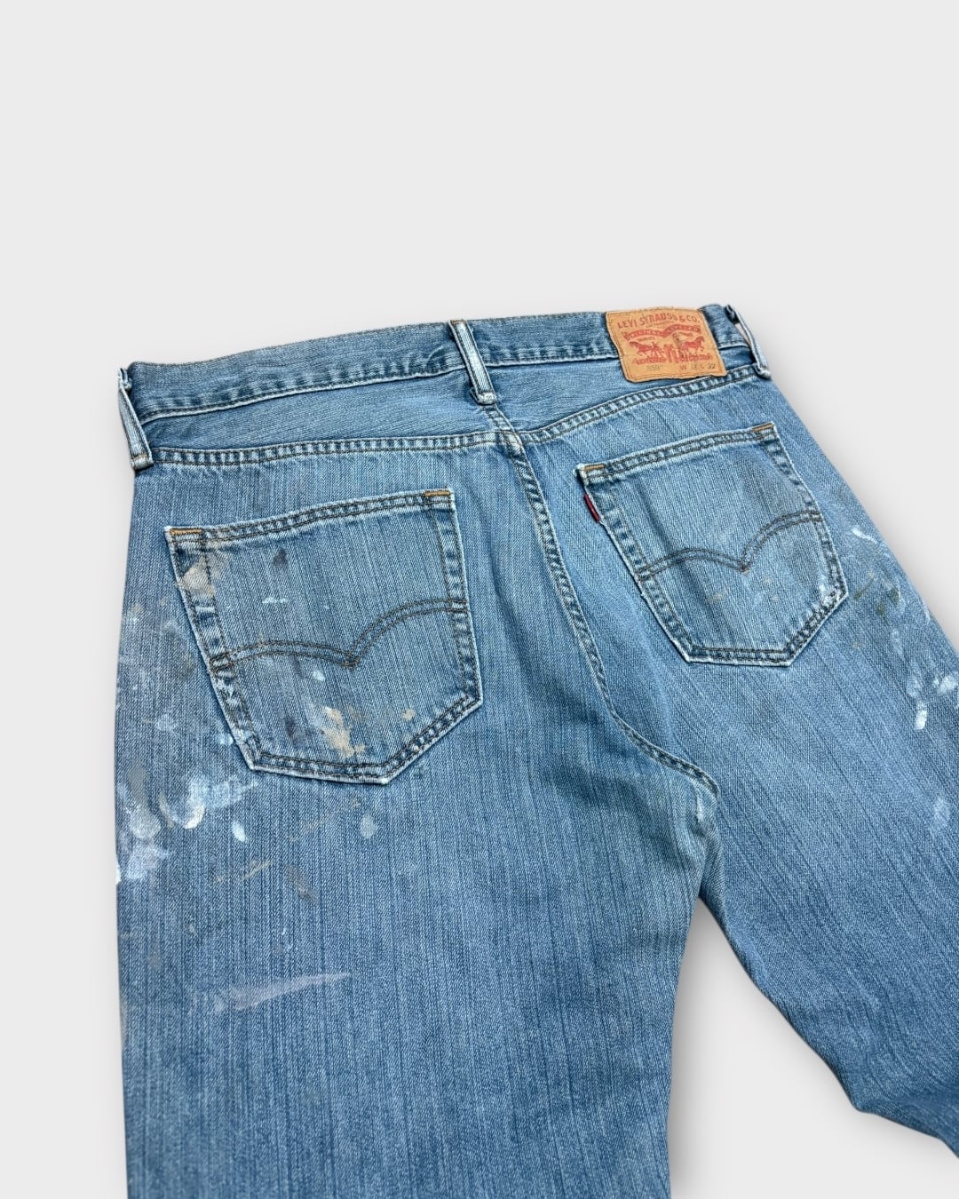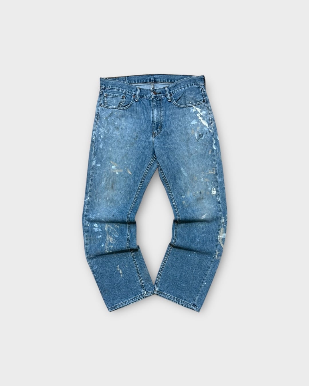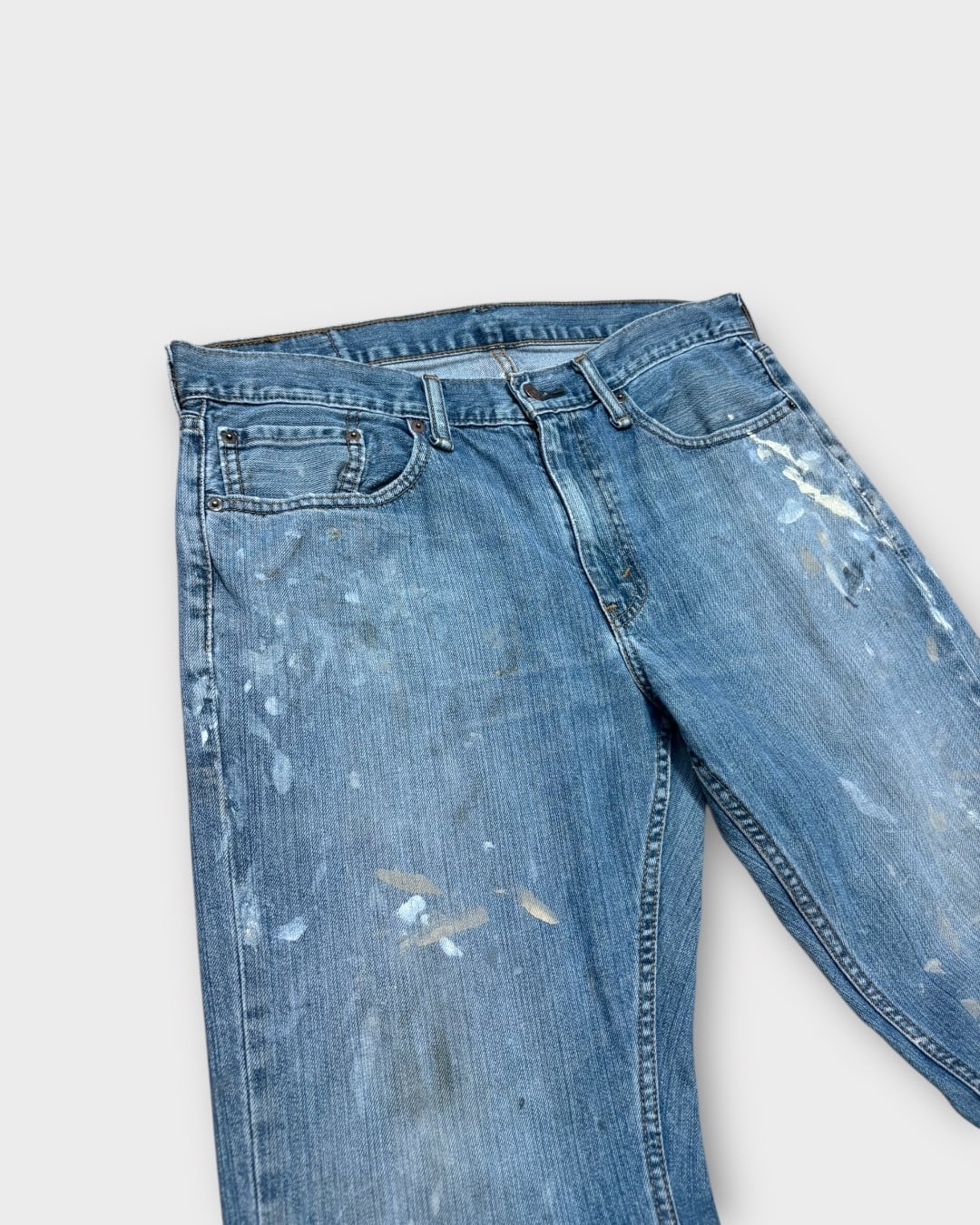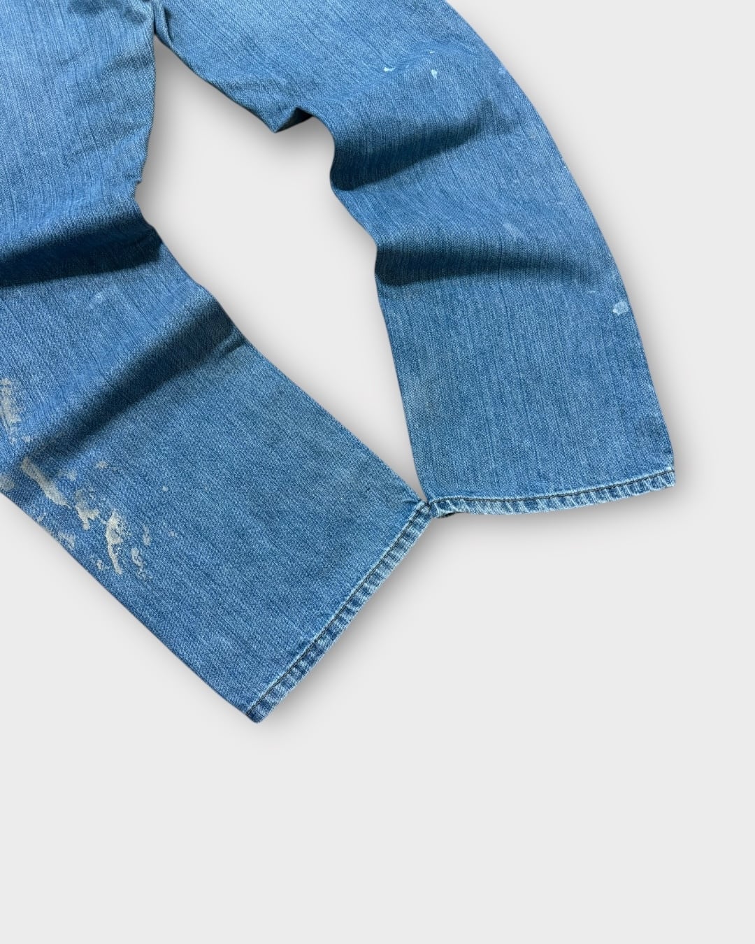 淡いインディゴのフェードと、リアルなペンキ跡が重なった表情豊かな一本です。