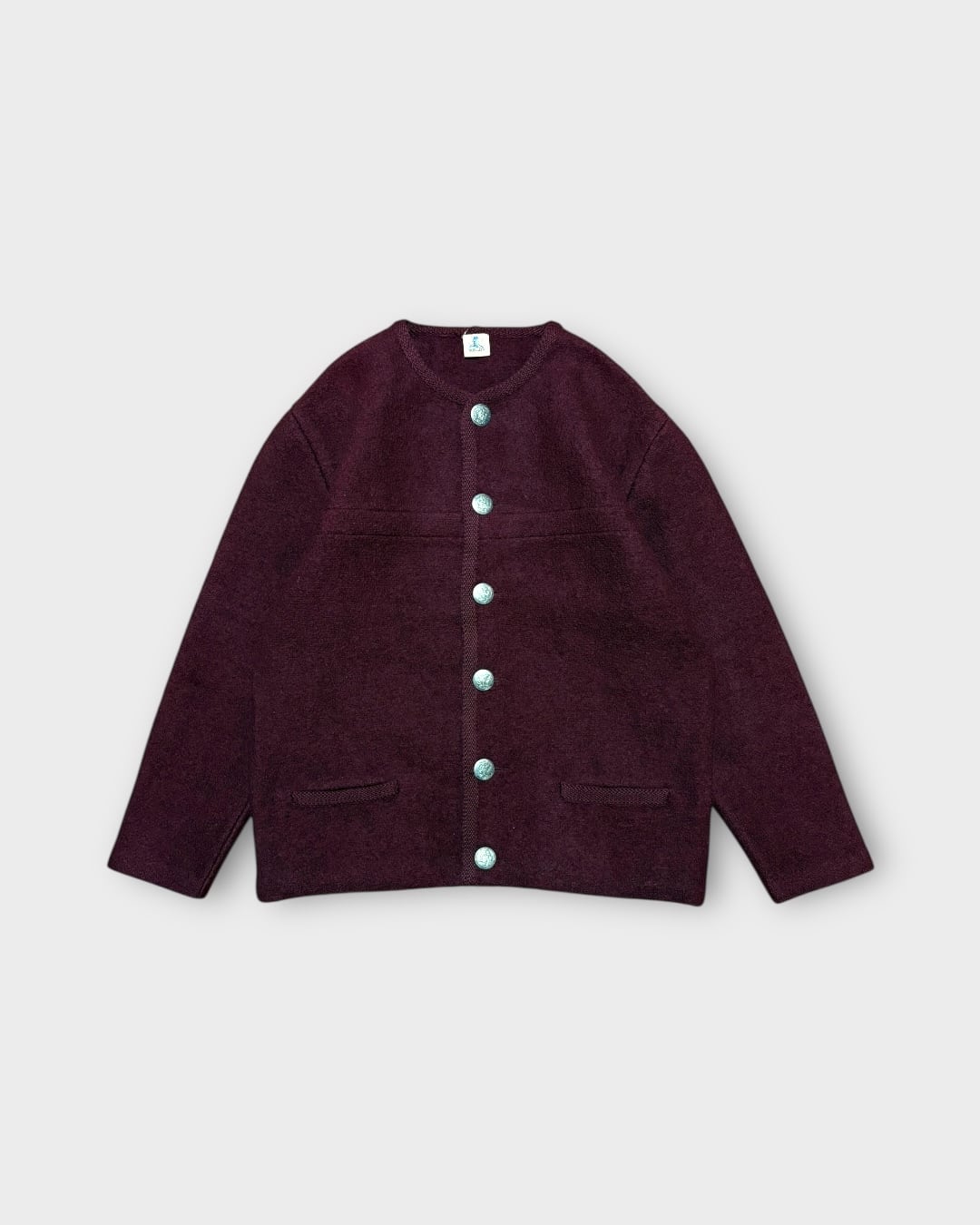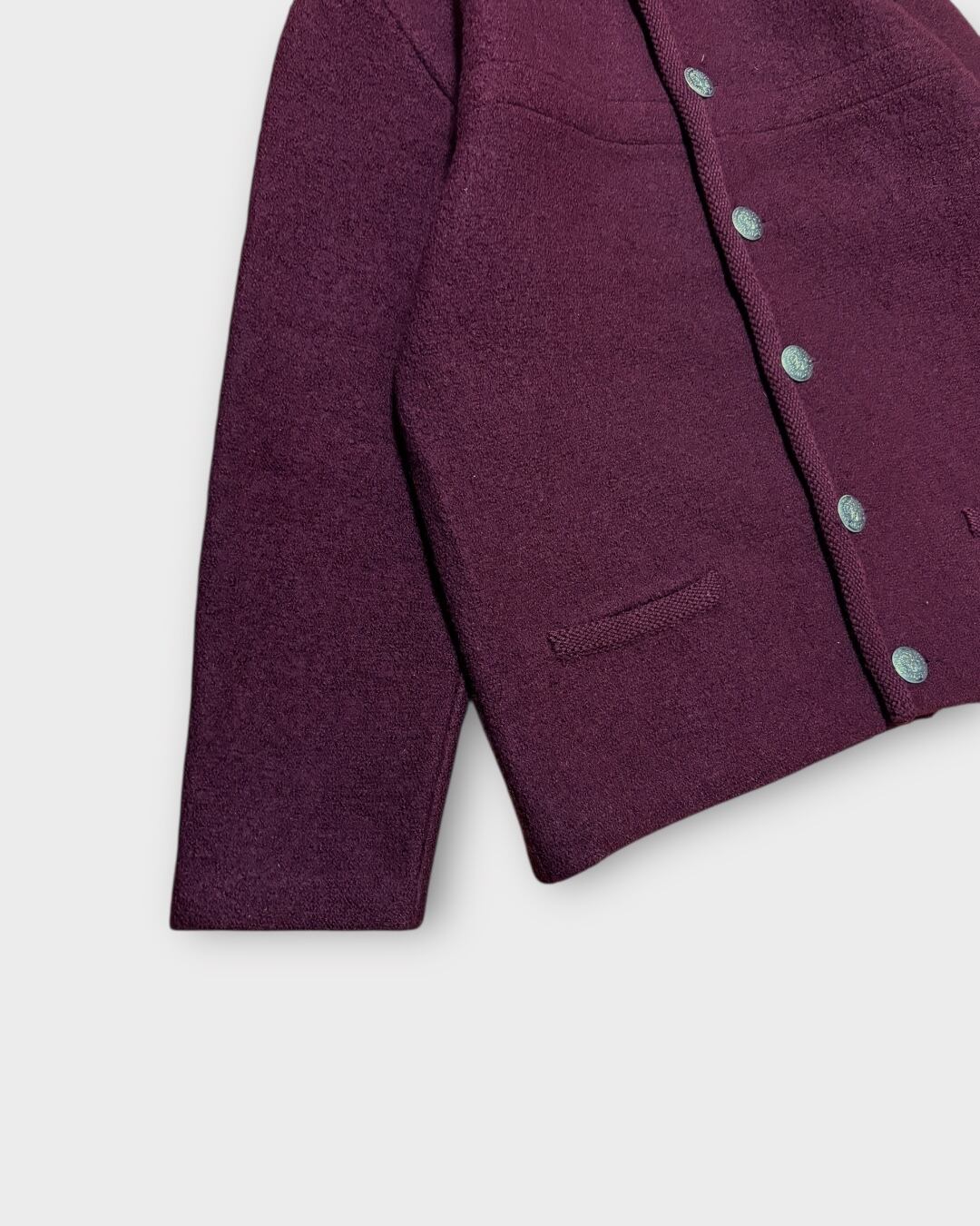 深みのあるバーガンディカラーに、紋章入りのメタルボタンが映えるクラシカルなデザイン。