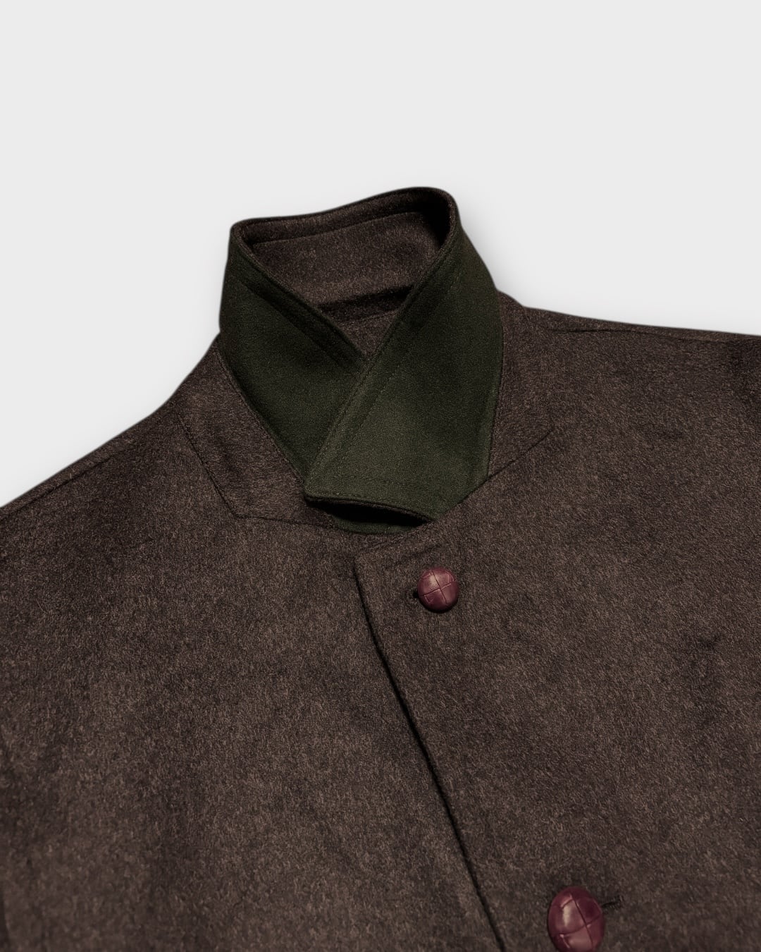 厚みのある生地ながら柔らかく、自然な光沢を帯びたダークブラウンのウールが印象的です。