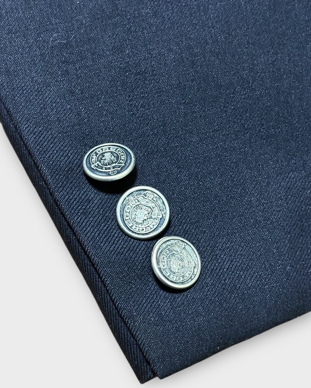 深いダークネイビーカラーに、シルバーのメタルボタンが映えるクラシックな一着。