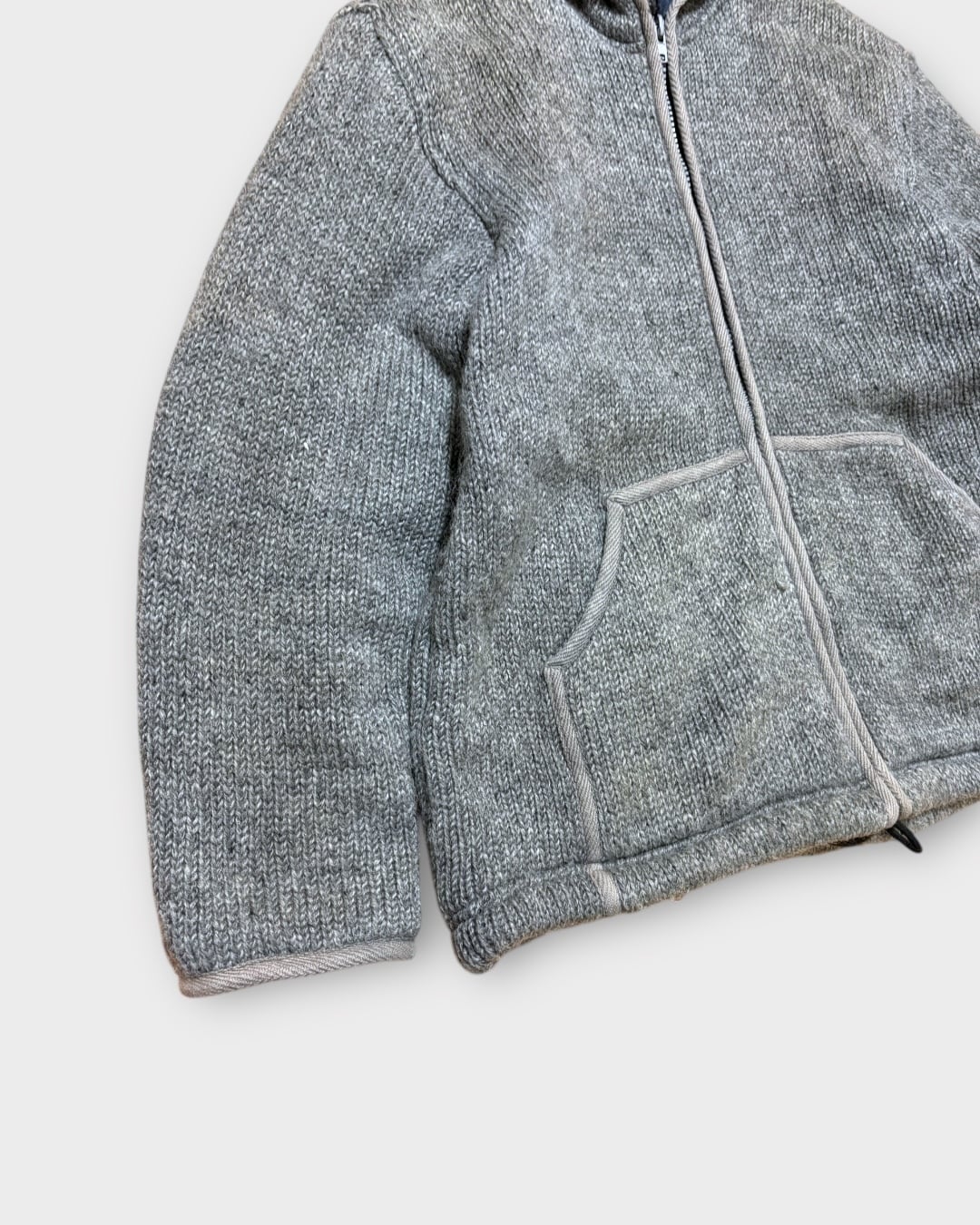 ローゲージで編まれた独特の表情のある一枚で、ウール100%の暖かさに裏フリースの高い保温性を組み合わせた珍しい仕様です。
