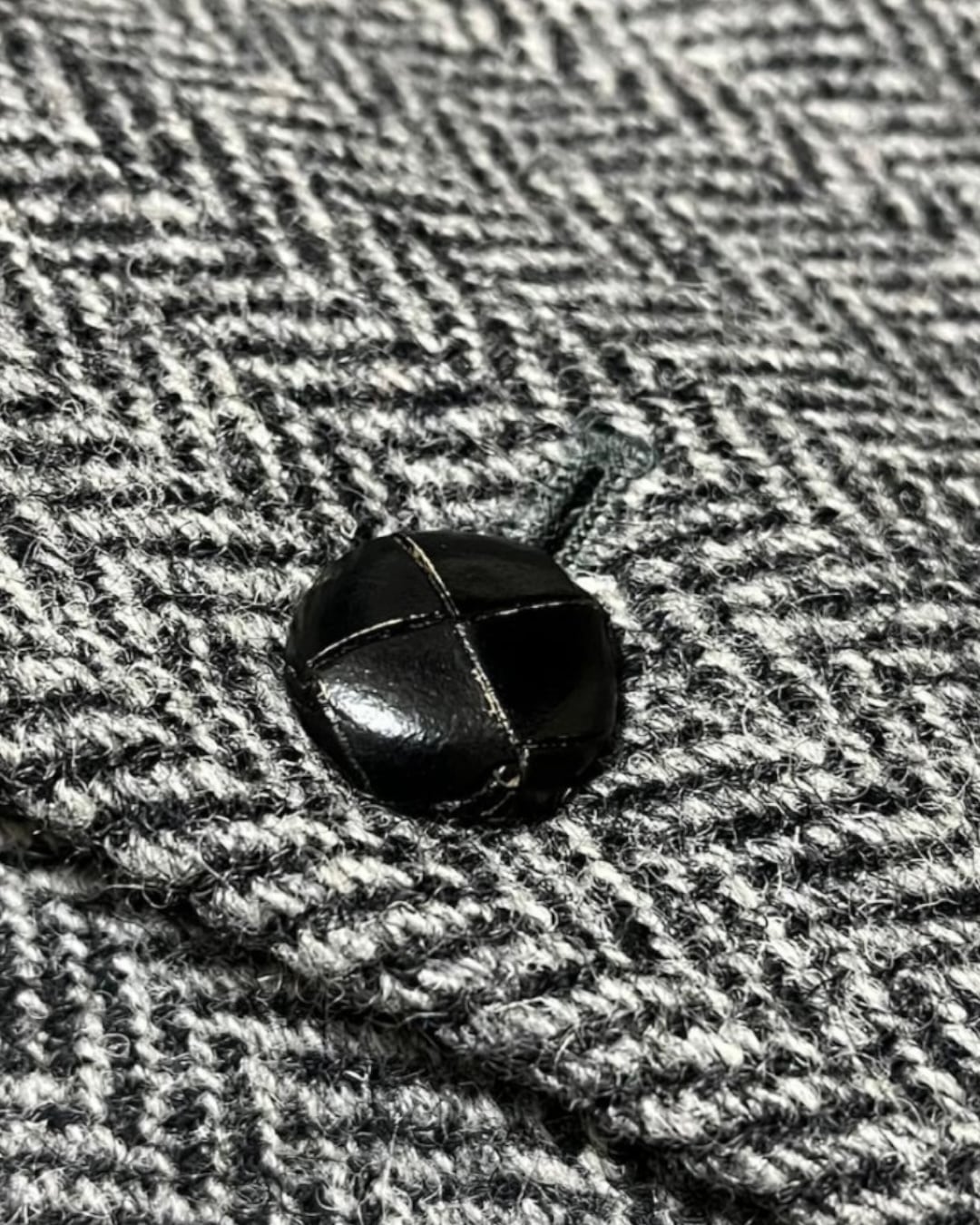 グレーを基調とした上品なヘリンボーンパターンで、ハリスツイードならではの重厚感と温かみのある風合いが魅力です。