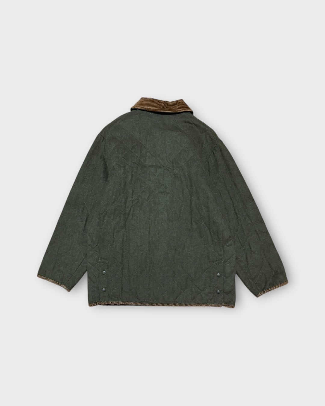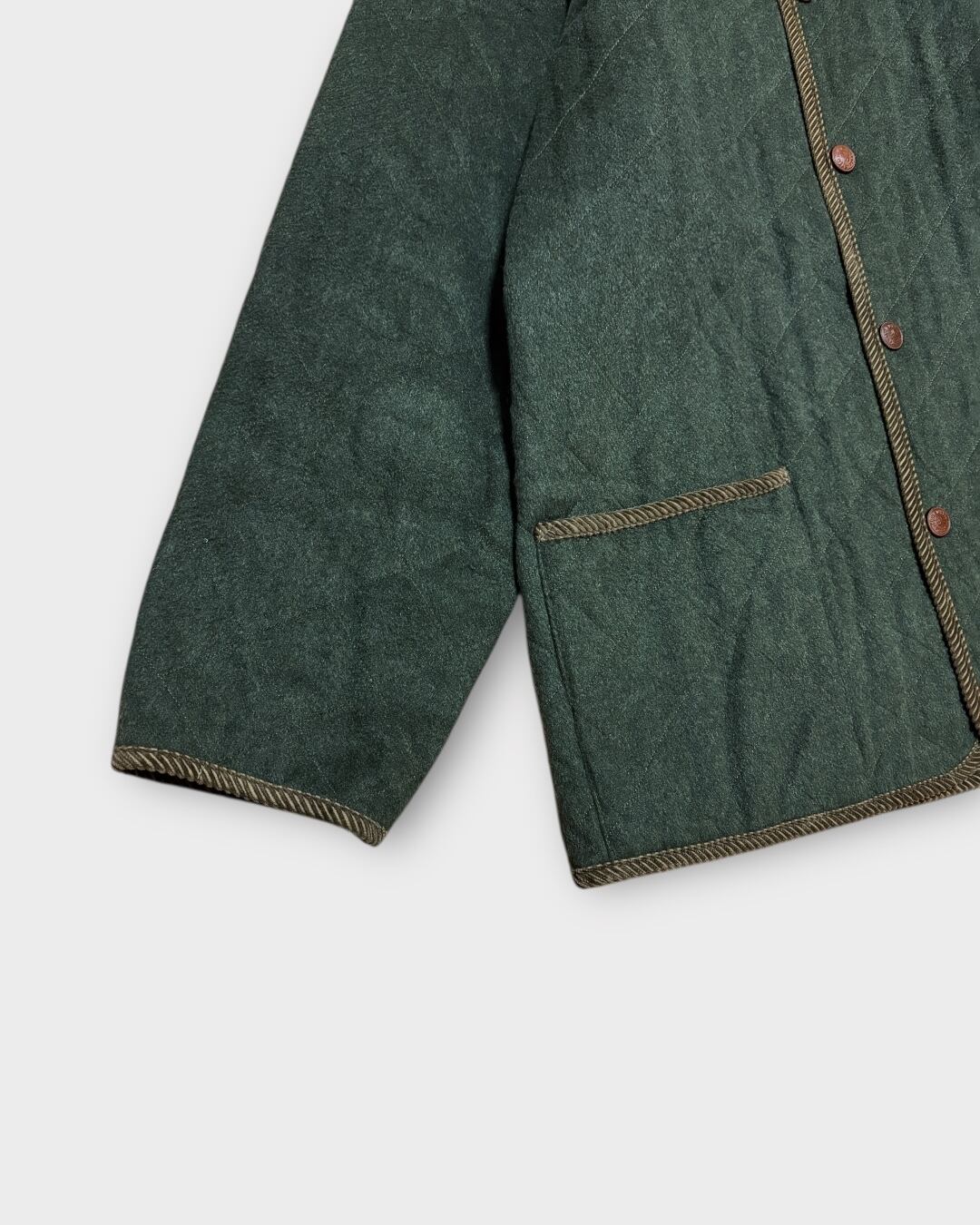 深みのあるフォレストグリーンのボディに、太畝コーデュロイの襟・パイピングを施した上品なカントリー調の一枚です。