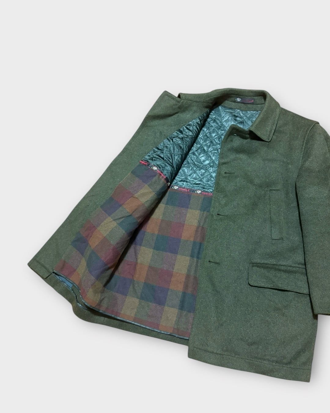 深みのあるダークグリーンのカラーリングに、伝統的な木製トグル調のボタン、チェック×キルティングの凝った裏地仕様が印象的な一着。