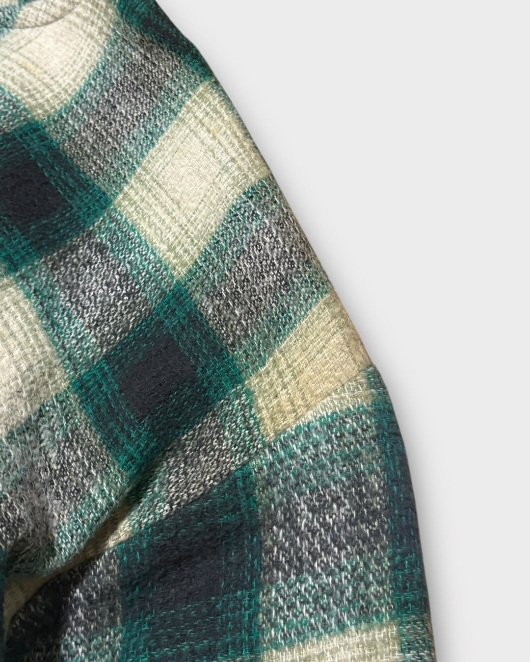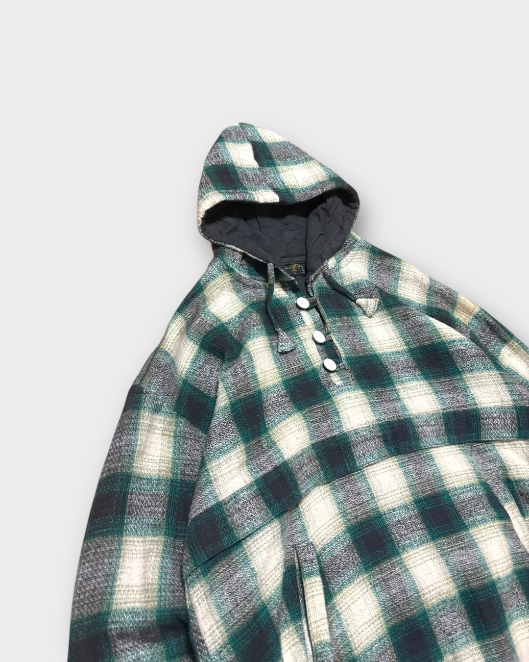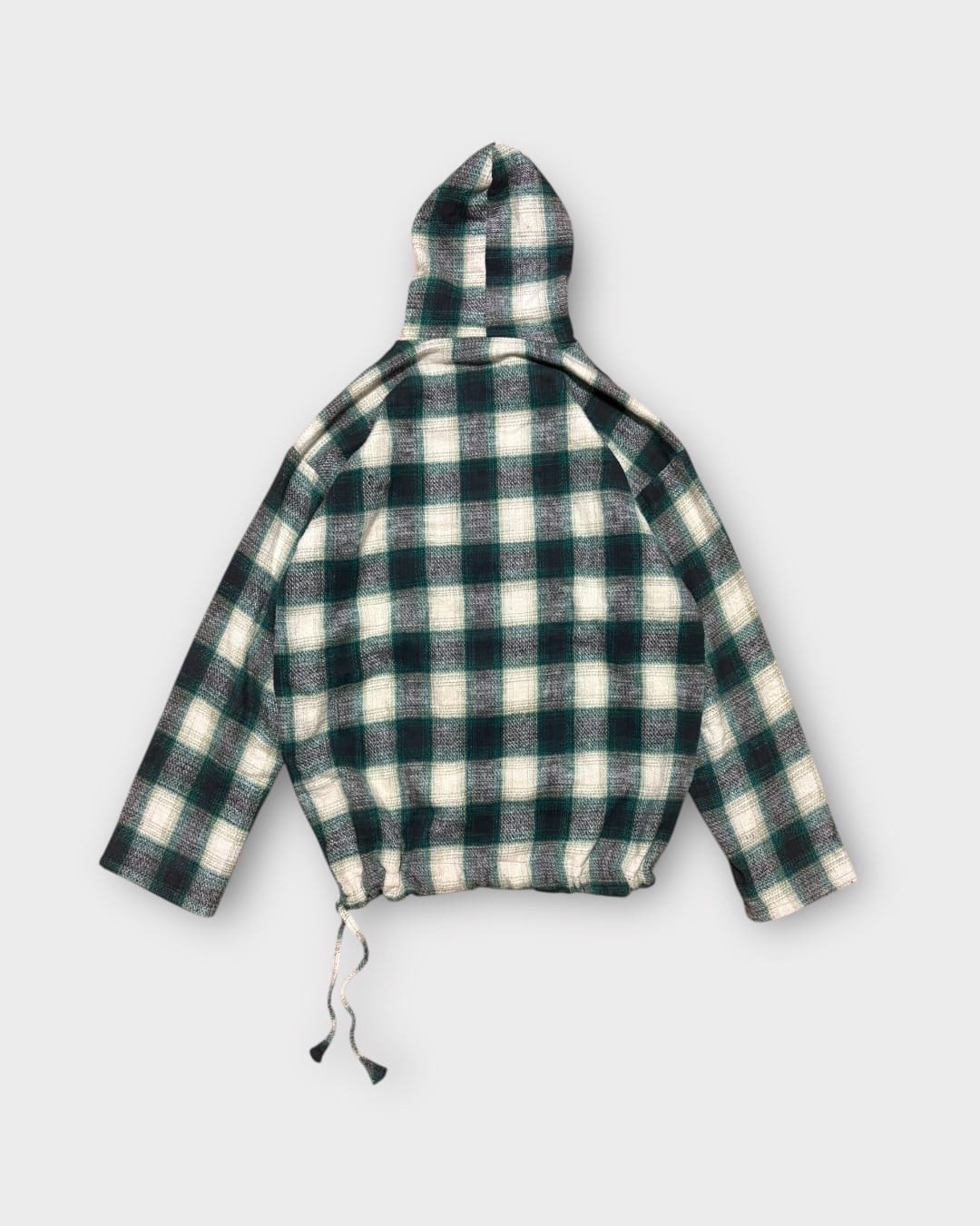 柔らかな風合いのコットン生地に、深いグリーンとグレーを基調としたチェック柄が特徴的な一枚です。フロントの4ボタン、裏地のブラックコットン、裾のドローコード仕様など細かなディテールも魅力。ゆったりとしたXXL表記ながら、バランスの良いシルエットで着こなしやすく、雰囲気のあるスタイルを作れます。