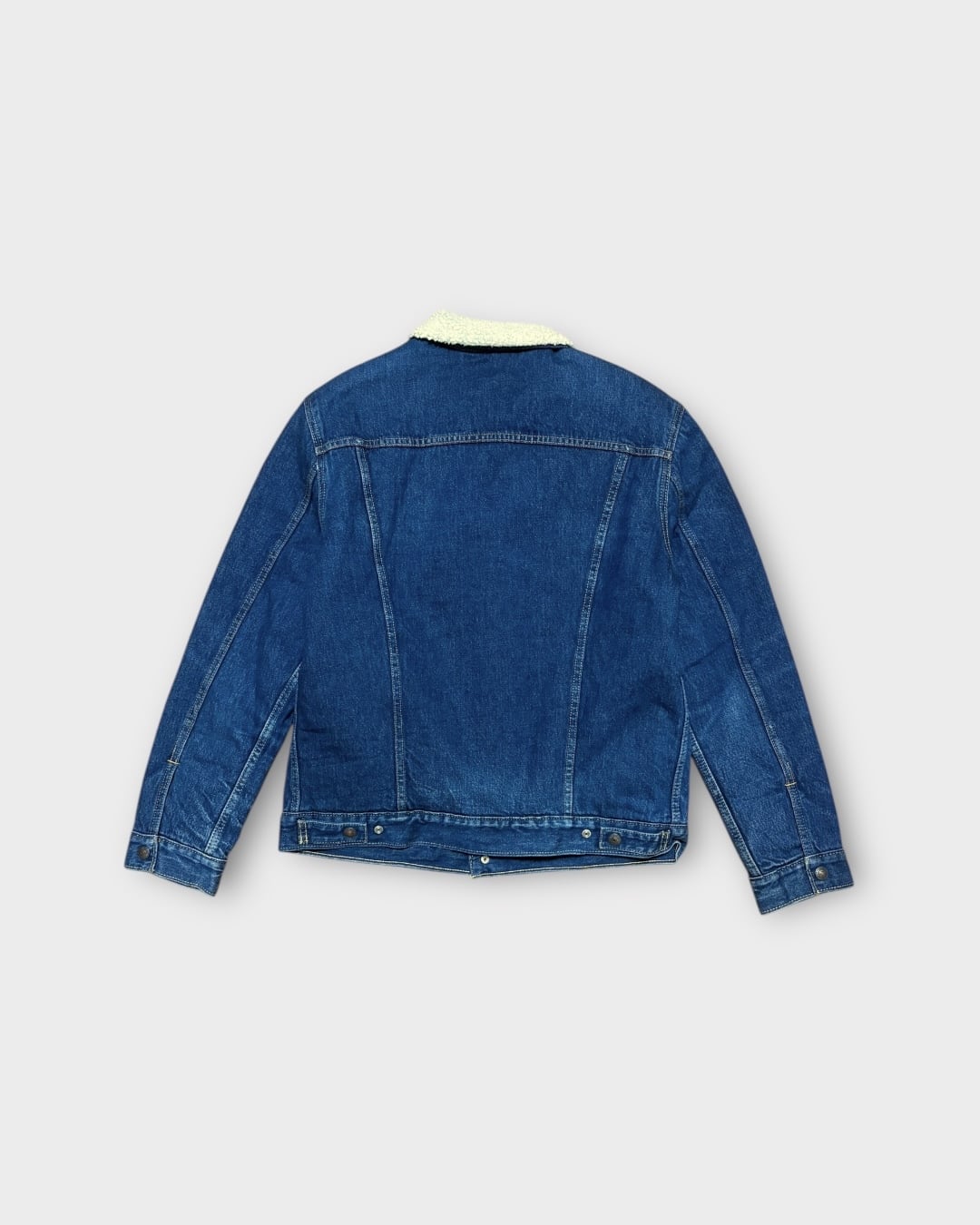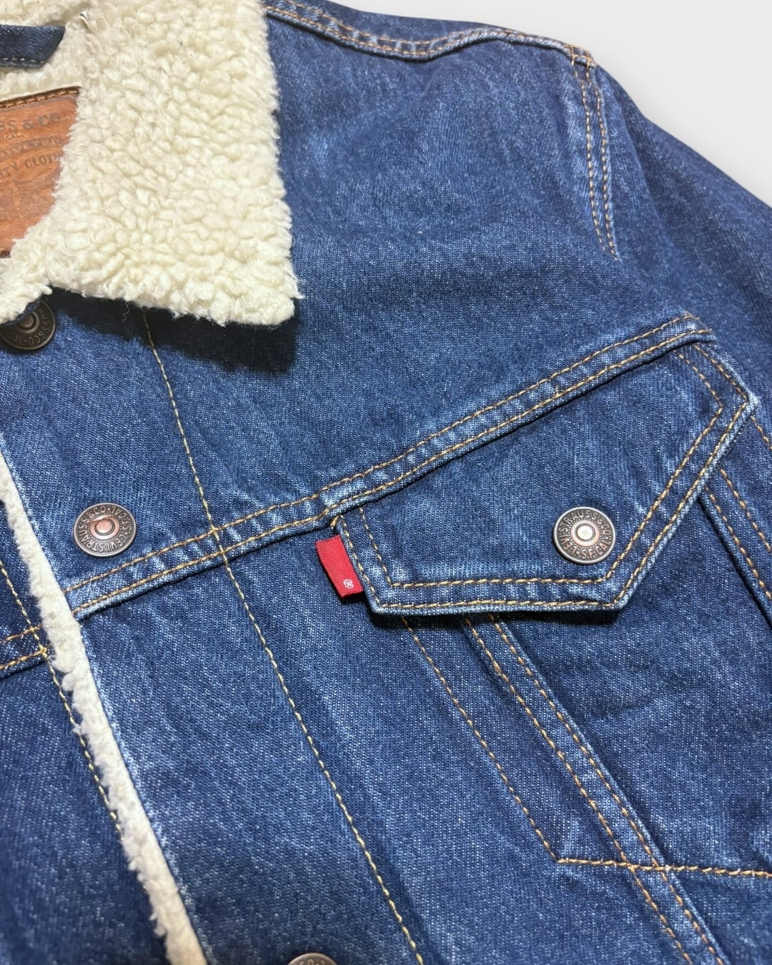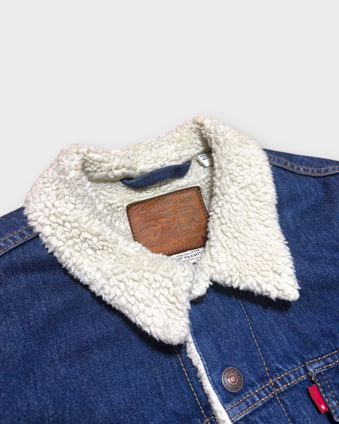 “Levi’s” のシェルパデニムジャケット。インディゴデニムにホワイトカラーのボアが映える、冬の定番として人気の高い一着です。