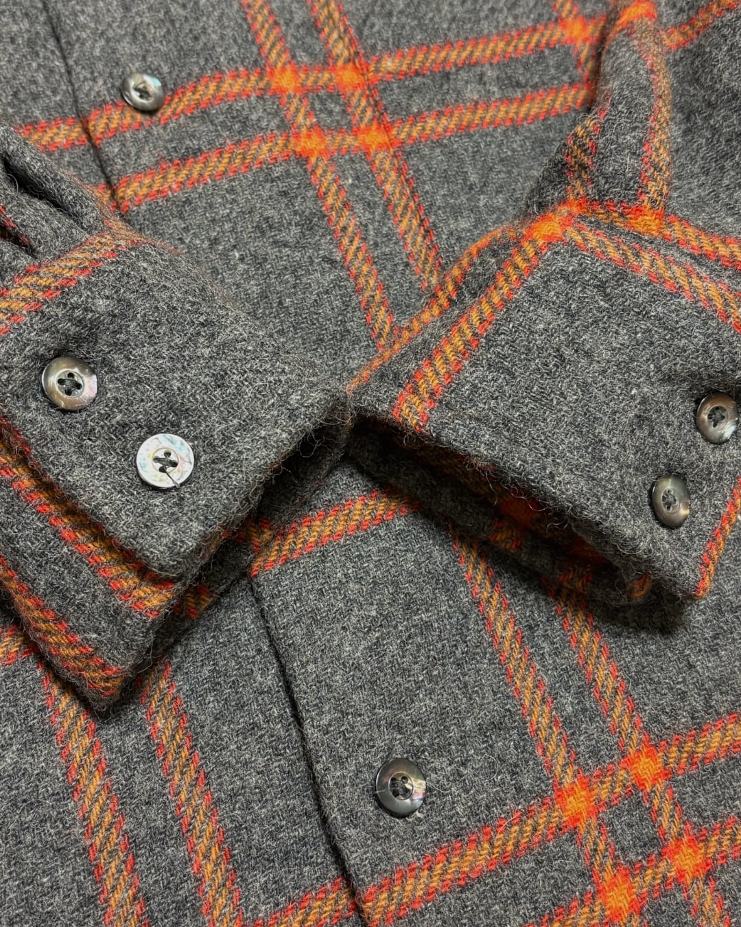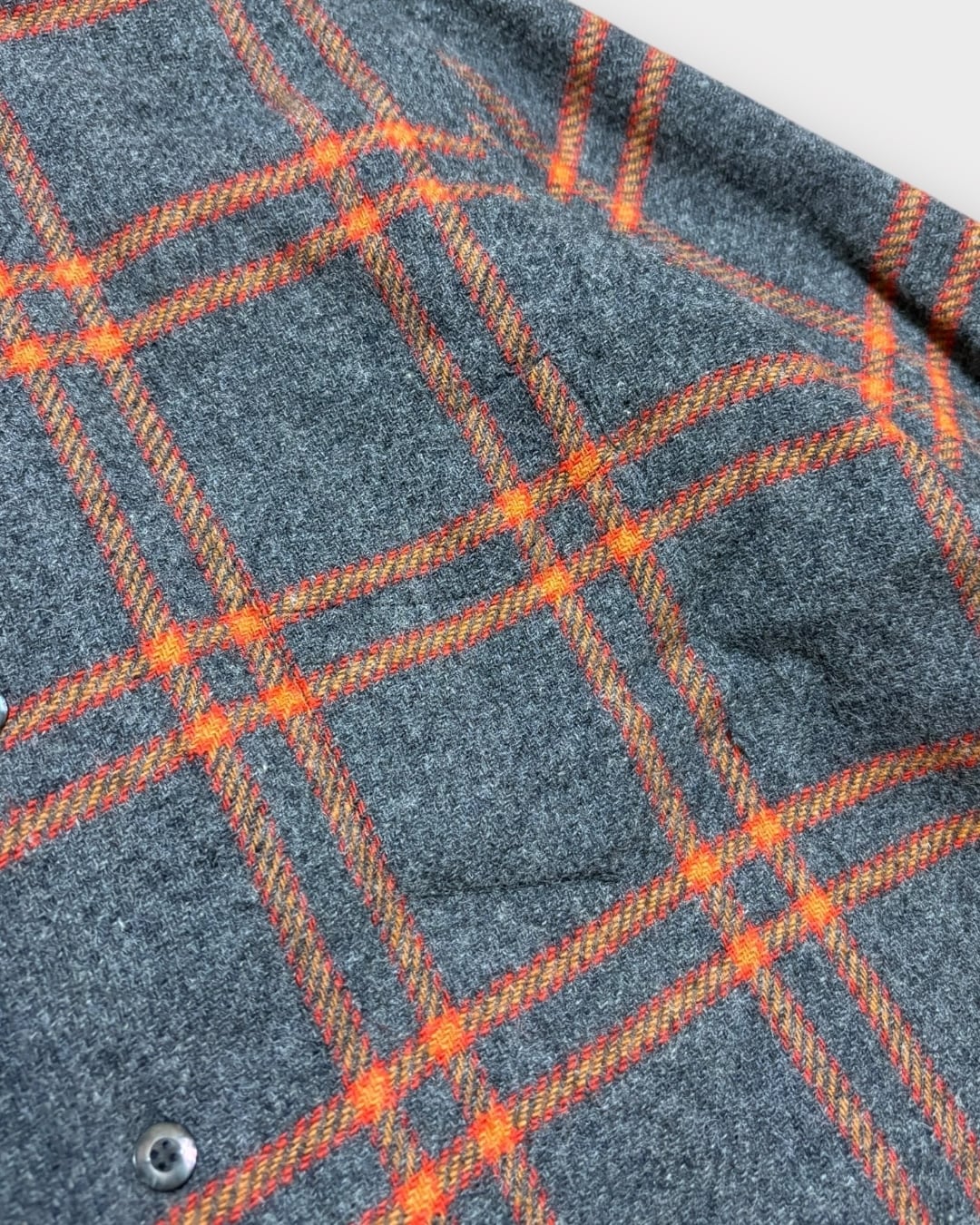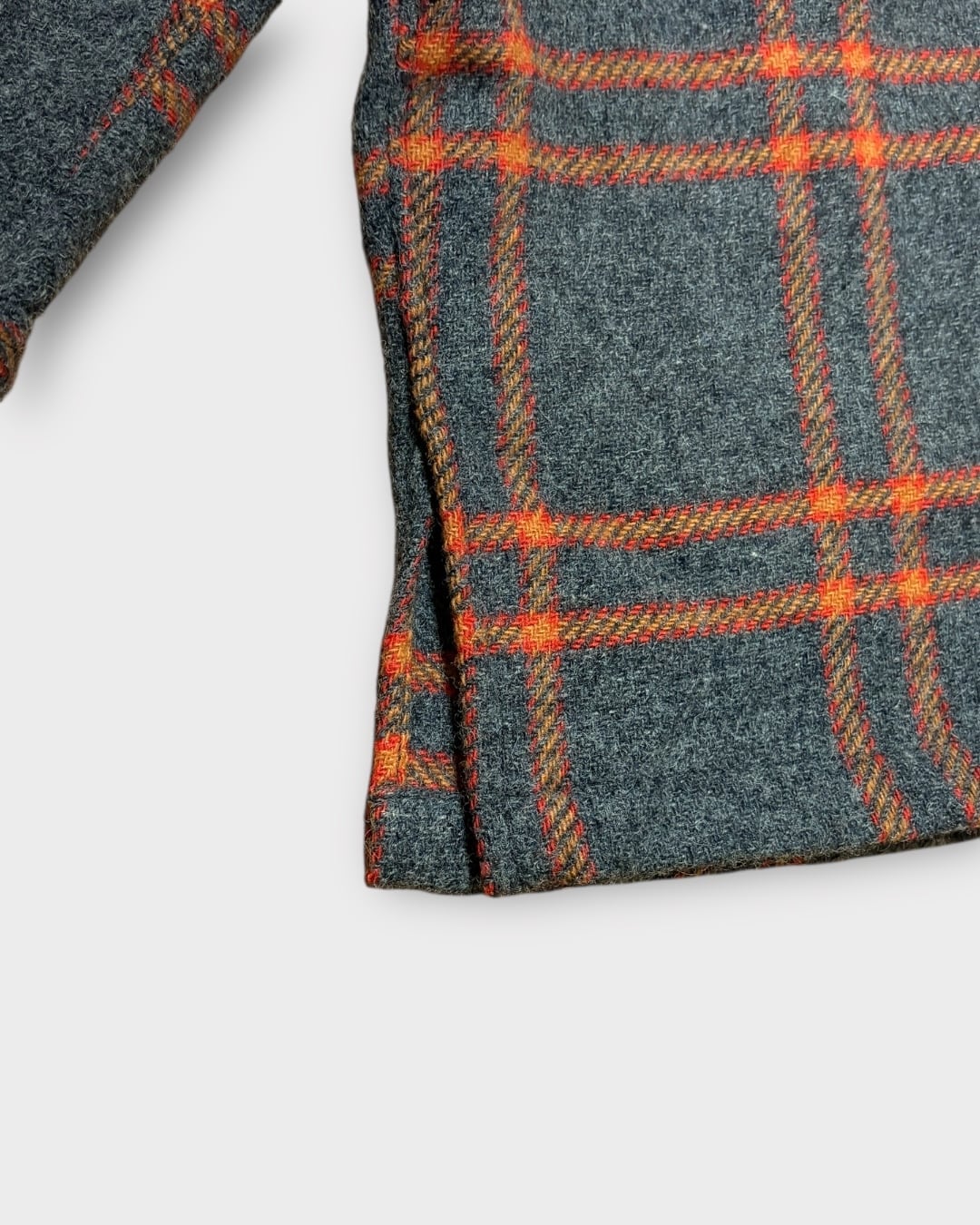ライトグレーをベースに、オレンジとレッドを効かせた大判の格子柄は、70年代らしい遊び心を感じさせつつ、どこか品の良さを残した配色です。