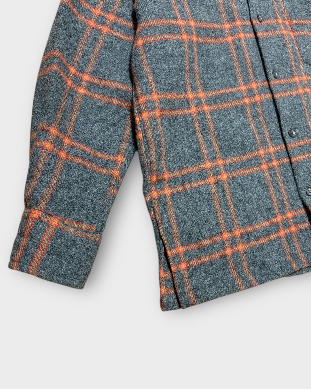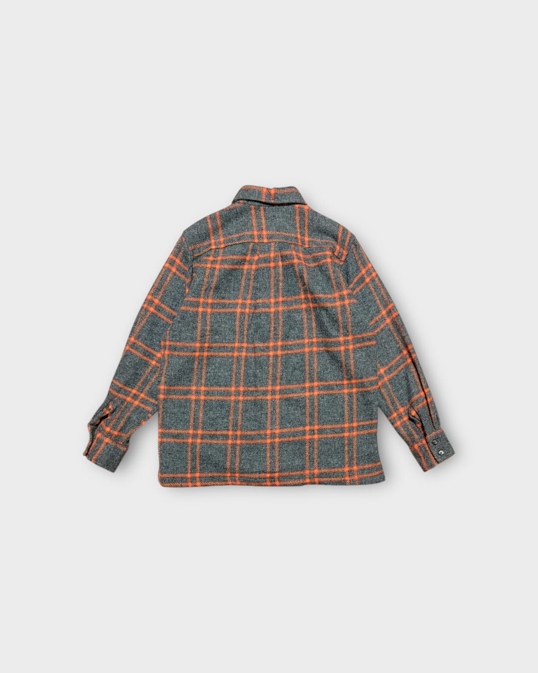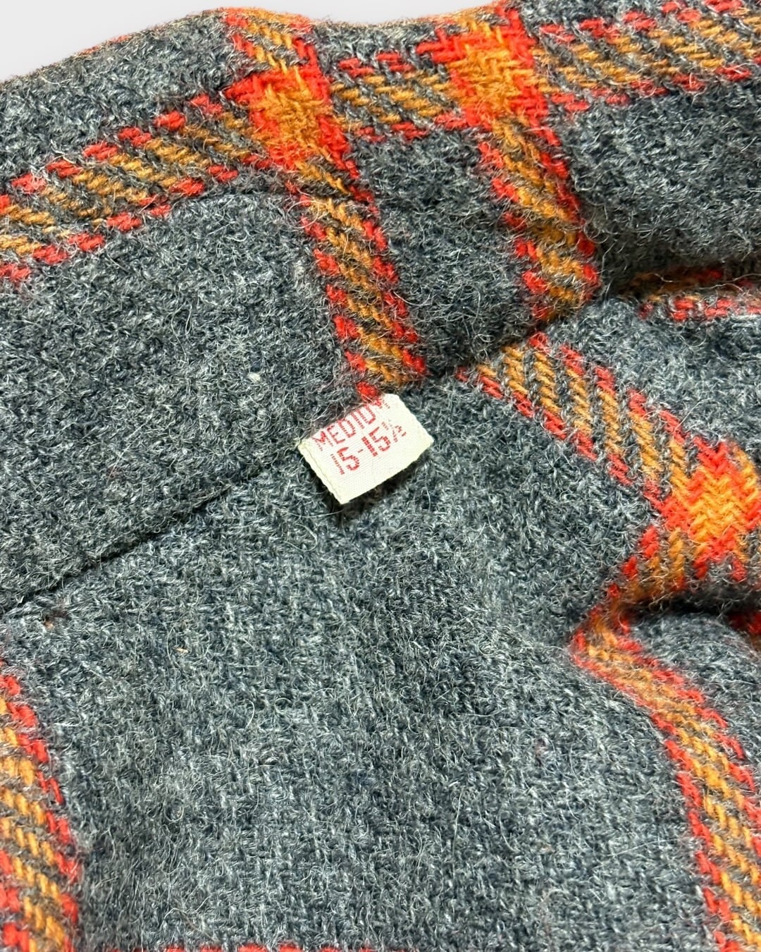 ライトグレーをベースに、オレンジとレッドを効かせた大判の格子柄は、70年代らしい遊び心を感じさせつつ、どこか品の良さを残した配色です。