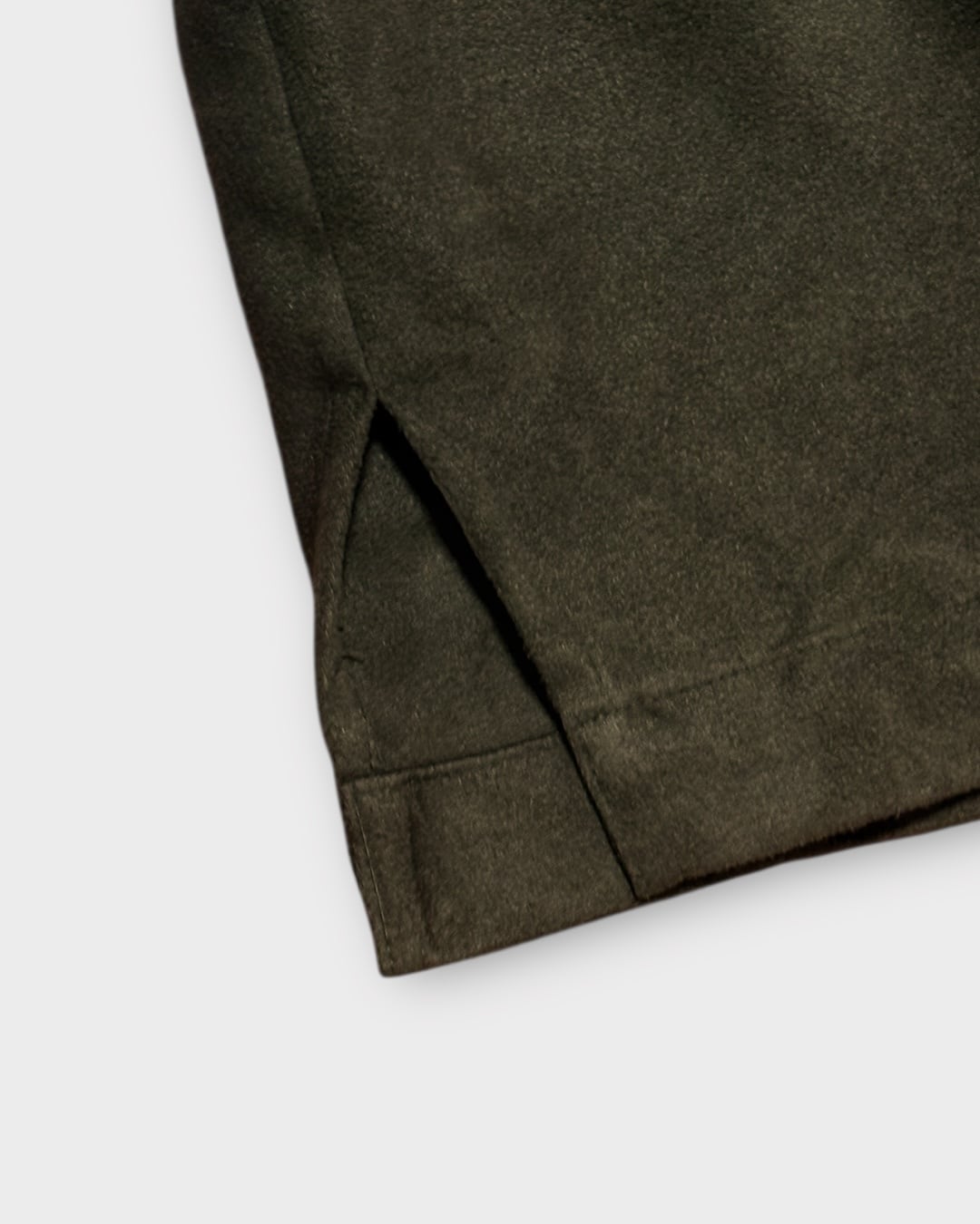 スエード調のポリエステル素材を使用した一枚で、マットな質感とムラ感のあるオリーブカラーが落ち着いた雰囲気を演出します。