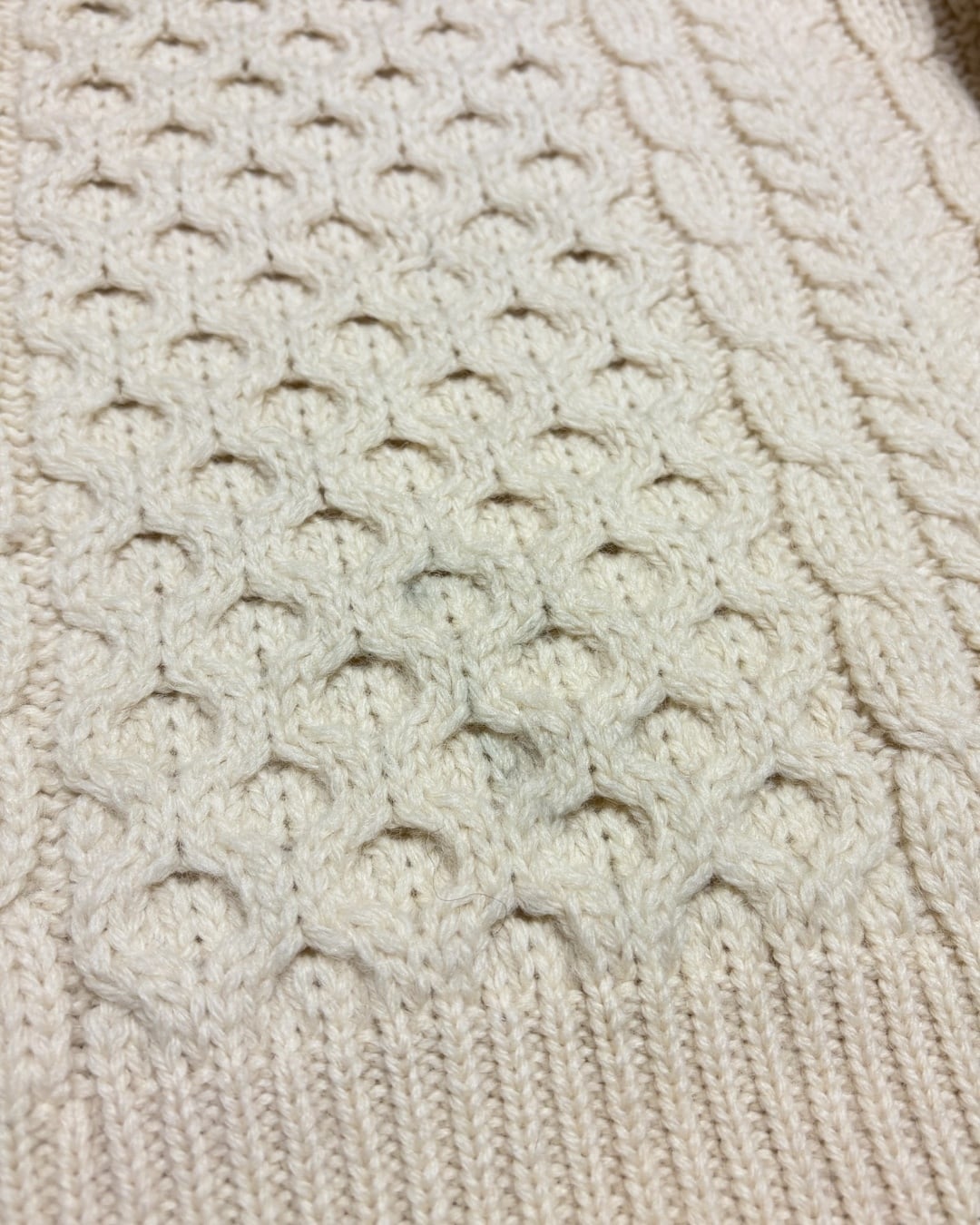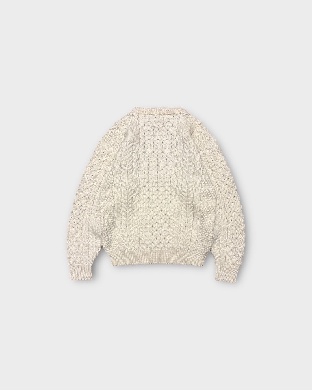 生成りカラーをベースに、立体感のあるケーブル編みが全体に施されたクラシックな表情。程よく肉厚なウール素材で、見た目以上に保温性も高く、秋冬の主役として着用できます。
