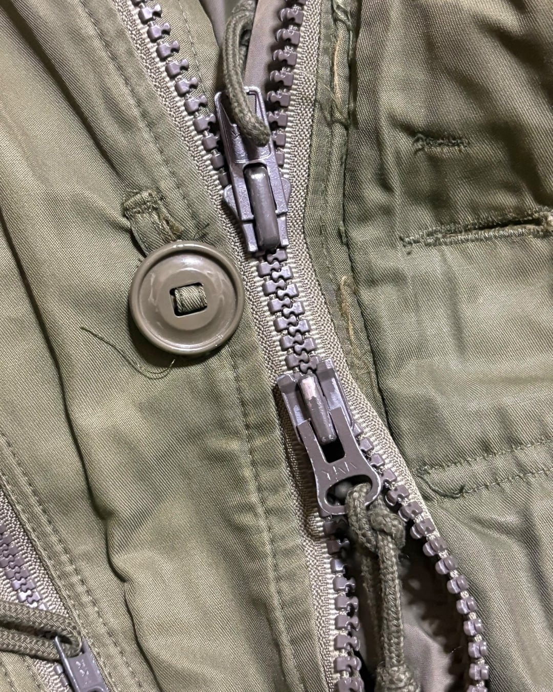 フロントはボタン+ダブルジップの二重構造、胸部スラッシュジップポケット、